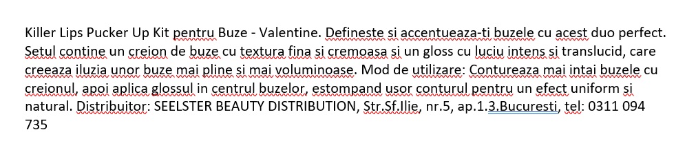 Ultima actualizare a informatiilor de prezentare pentru Kit Luciu de buze 3.8 ml + Creion de buze 1 g Pucker Up, Valentine, Killer Lips a fost efectuata la data de 07-04-2026.  |  Raporteaza Descriere Gresita