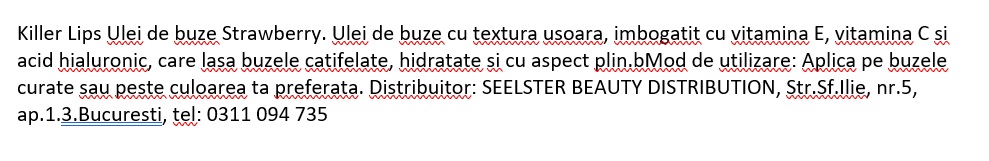 Killer Lips Ulei de buze Strawberry oferă o experiență delicioasă de îngrijire, hidratând buzele uscate și oferindu-le un luciu irezistibil cu aromă de căpșuni. Formula sa colorată și parfumată lasă buzele moi, netede și catifelate, fără reziduuri lipicioase. Aplicatorul lat și flexibil se mulează perfect pe buze, asigurând o aplicare uniformă și ușoară. Ideal pentru utilizare zilnică, conferă buzelor un aspect sănătos și radiant. Disponibil în arome: Vanilla, Peach, Watermelon, Strawberry și Coconut. Certificat PETA – Cruelty-Free & Vegan Friendly.