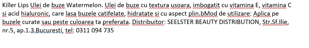 Ultima actualizare a informatiilor de prezentare pentru Ulei pentru buze Super Juicy Lip Oil, Watermelon, 3.8 ml, Killer Lips a fost efectuata la data de 23-04-2026.  |  Raporteaza Descriere Gresita
