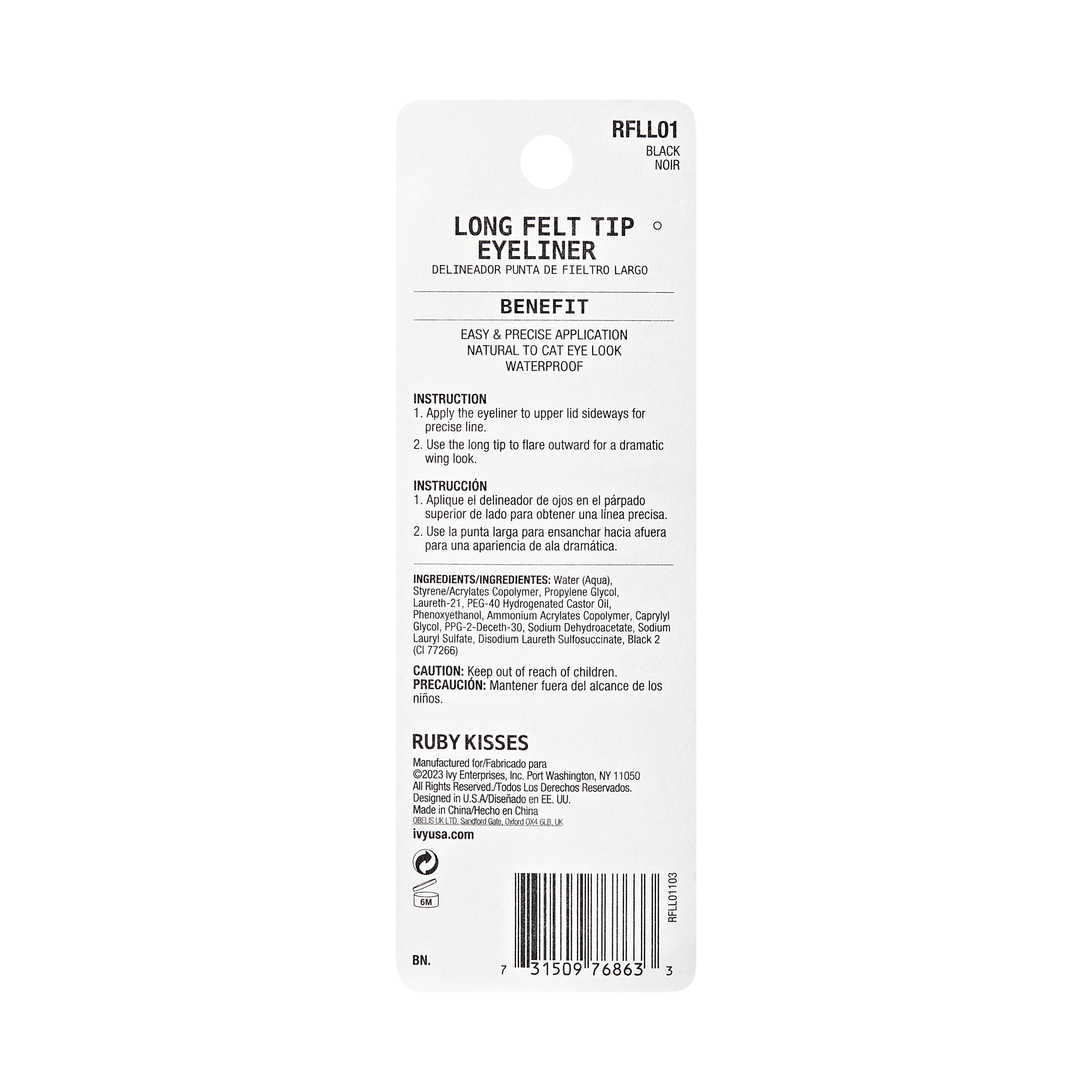 Ruby Kisses Tus ochi Long Felt Tip – Black, 1.2 ml este un eyeliner rezistent la apa, creat pentru definirea precisa si intensa a ochilor. Formula sa de lunga durata, combinata cu varful tip pensula lunga, permite trasarea unor linii ultraprecise, de la cele subtile, naturale, pana la look-uri dramatice. Ideal pentru machiajul zilnic sau profesional, acest tus ofera control excelent si culoare intensa, negru profund.
