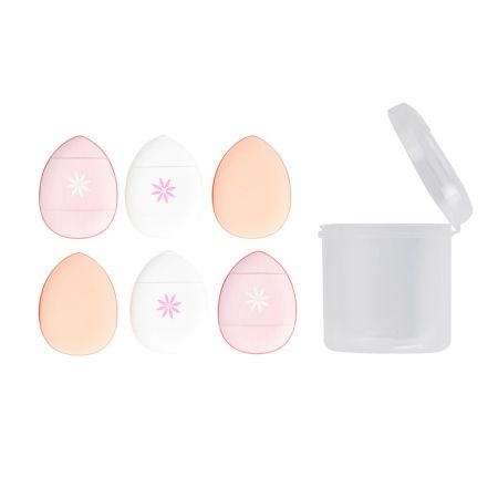Setul conține 6 bureți mini și un suport practic, perfect pentru utilizarea zilnică sau pentru retușuri în deplasare.