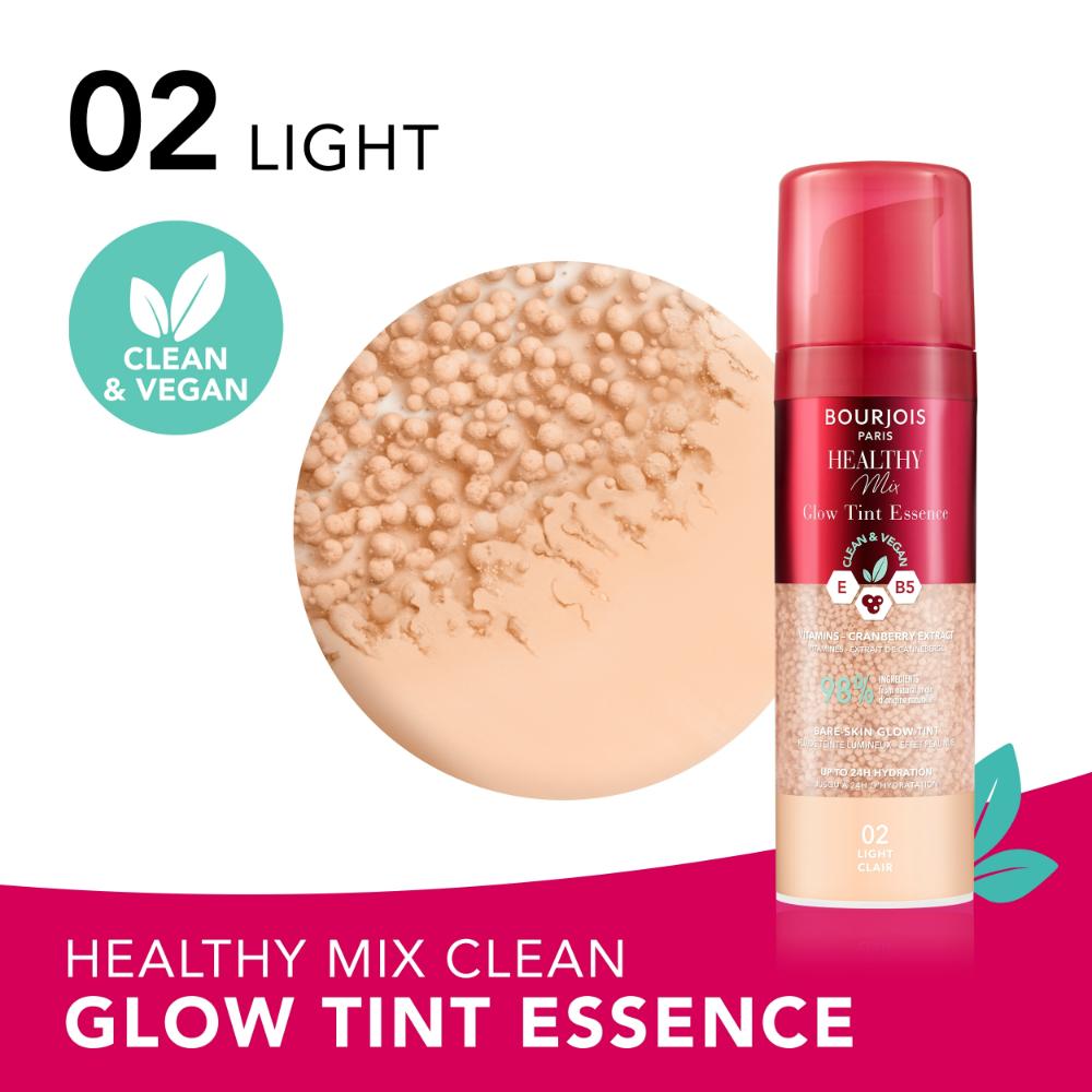 Bourjois Healthy Mix Glow Tint Essence este o cremă colorantă cu textură proaspătă și lejeră, care oferă pielii un aspect natural, uniform și luminos. Formula inovatoare conține 71% apă, asigurând o hidratare de până la 24 de ore, în timp ce vitaminele E și B5 contribuie la îmbunătățirea aspectului pielii. Produsul estompează vizibil aspectul porilor, reduce roșeața și lasă un efect de filtru radiant, pentru o strălucire sănătoasă și naturală. Poate fi folosită singură, pentru un look ușor, sau ca bază de machiaj, înaintea fondului de ten.