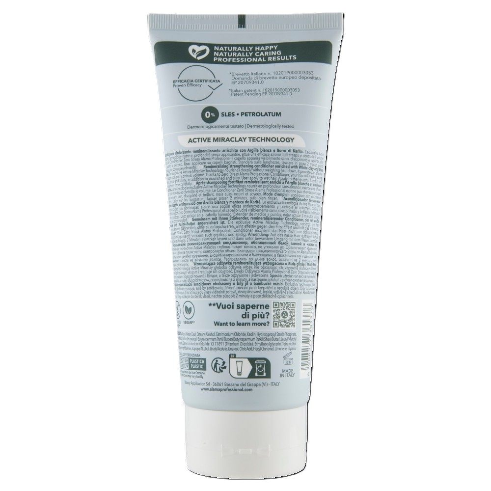 Balsamul fortifiant Alama Zero Stress oferă o ingrijire intensa pentru parul slabit, deshidratat sau dificil de controlat. Formula sa remineralizanta, imbogatita cu argila alba si unt de shea, hraneste fara sa incarce, disciplineaza firele rebele si reduce efectul de frizz. Datorita tehnologiei avansate Active Miraclay Technology, parul devine vizibil mai neted, mai puternic si mult mai stralucitor.