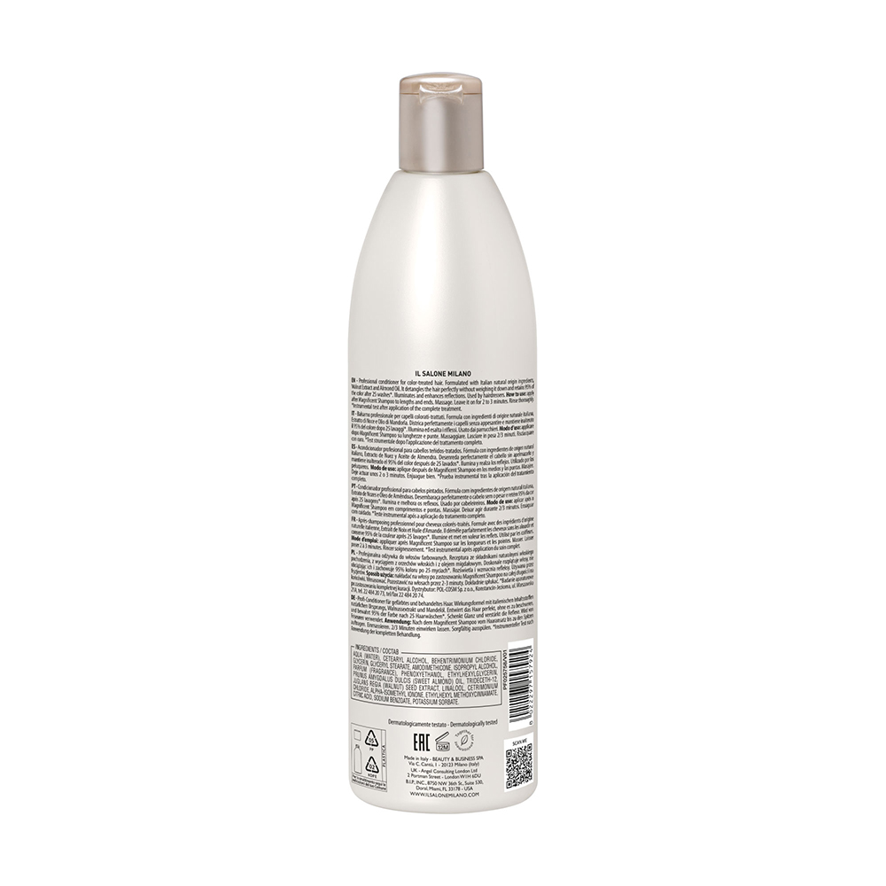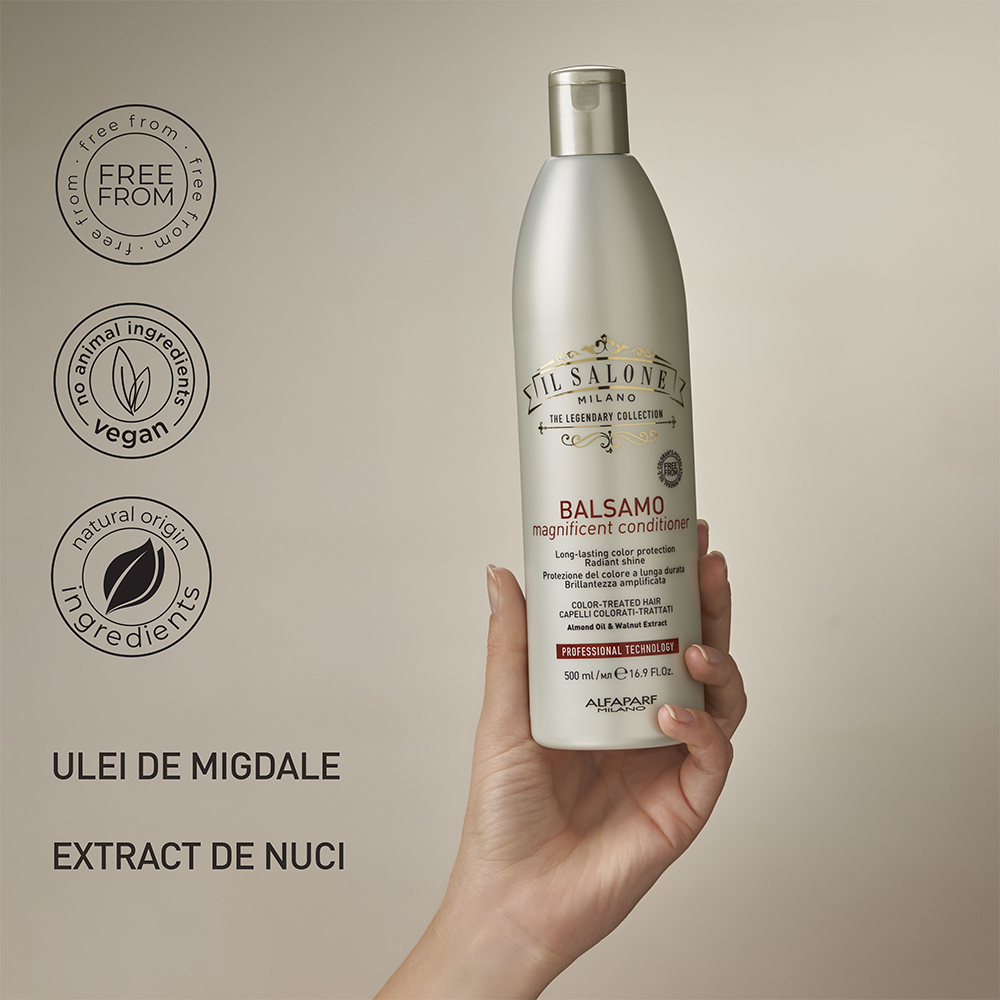 Balsamul profesional Il Salone Magnificent este special conceput pentru îngrijirea părului vopsit, oferindu-i netezime, hidratare și protecție împotriva pierderii culorii. Formula sa, bazată pe ulei de migdale dulci și extract de nucă, menține până la 95% din intensitatea culorii până la 25 de spălări*, hrănind intens și prevenind deteriorarea fibrei capilare. Părul devine mai moale, mai strălucitor și ușor de descurcat, fără a fi încărcat.