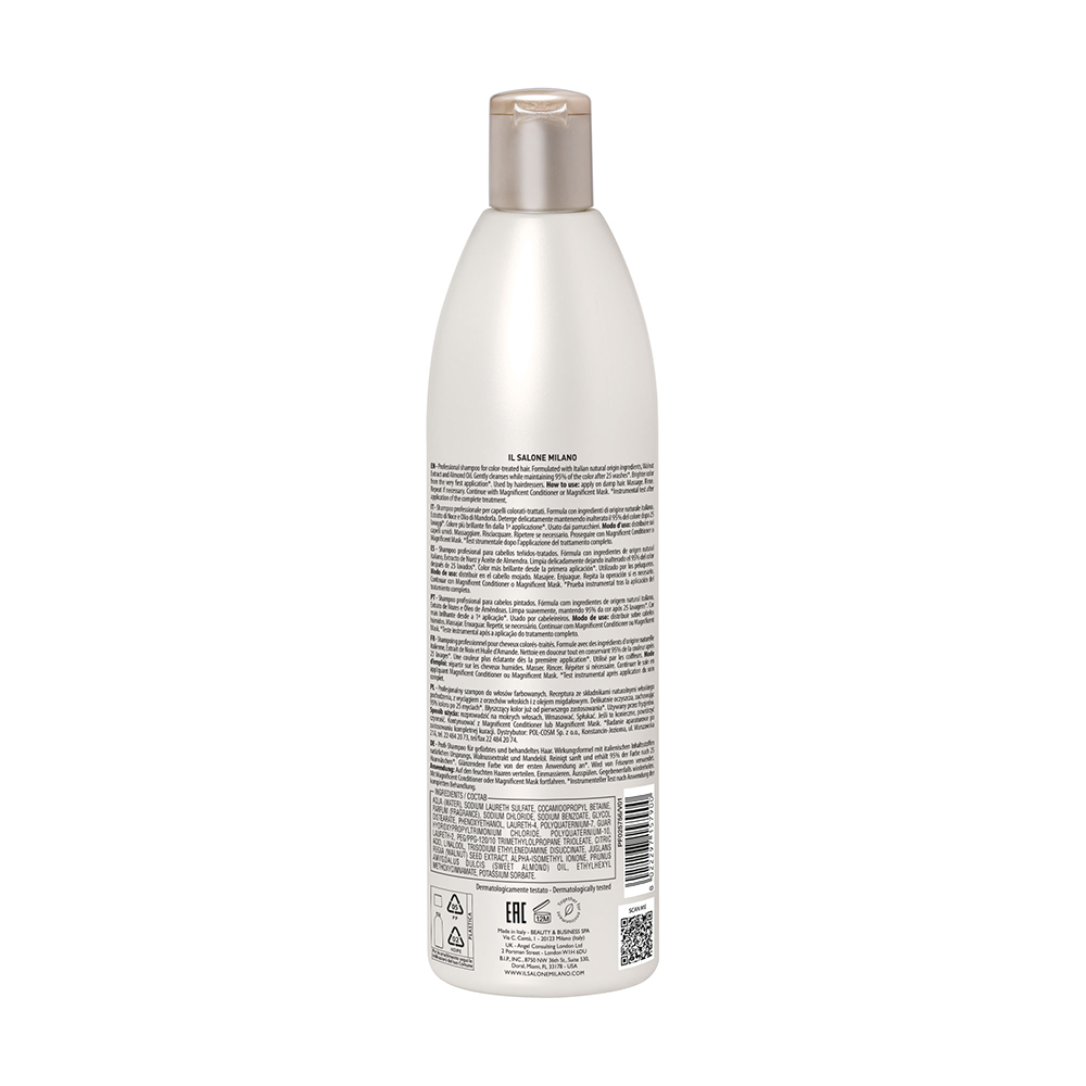Il Salone Magnificent Shampoo este un șampon profesional creat pentru îngrijirea părului vopsit, oferind curățare delicată și protecție intensivă a culorii. Formula sa cu ulei de migdale dulci și extract de nucă menține până la 95% din intensitatea culorii până la 25 de spălări*, lăsând părul mai strălucitor încă de la prima utilizare. Ingredientele de origine naturală contribuie la fortificarea fibrei capilare și la menținerea hidratării optime, pentru un păr suplu și catifelat.