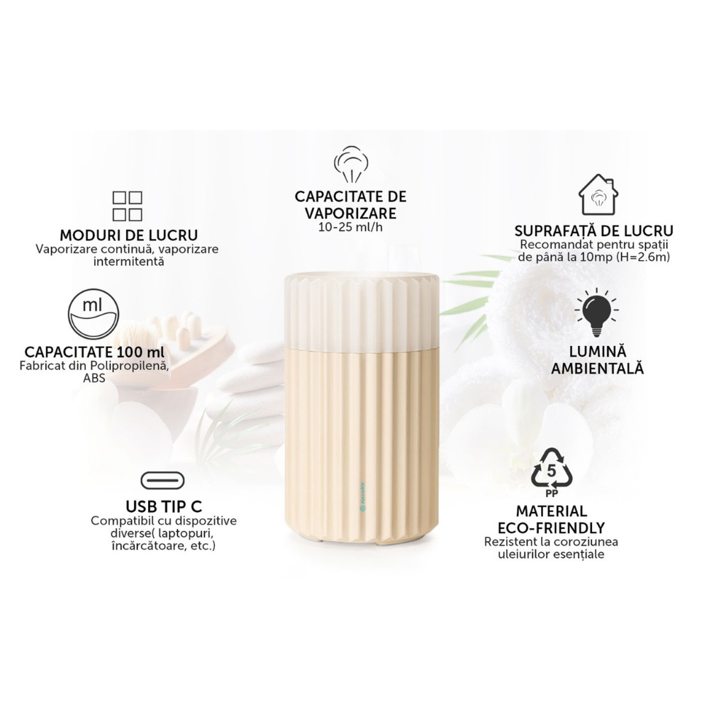 - Funcție Auto-Off pentru siguranță – difuzorul se oprește automat atunci când rezervorul rămâne fără apă, prevenind deteriorarea aparatului.