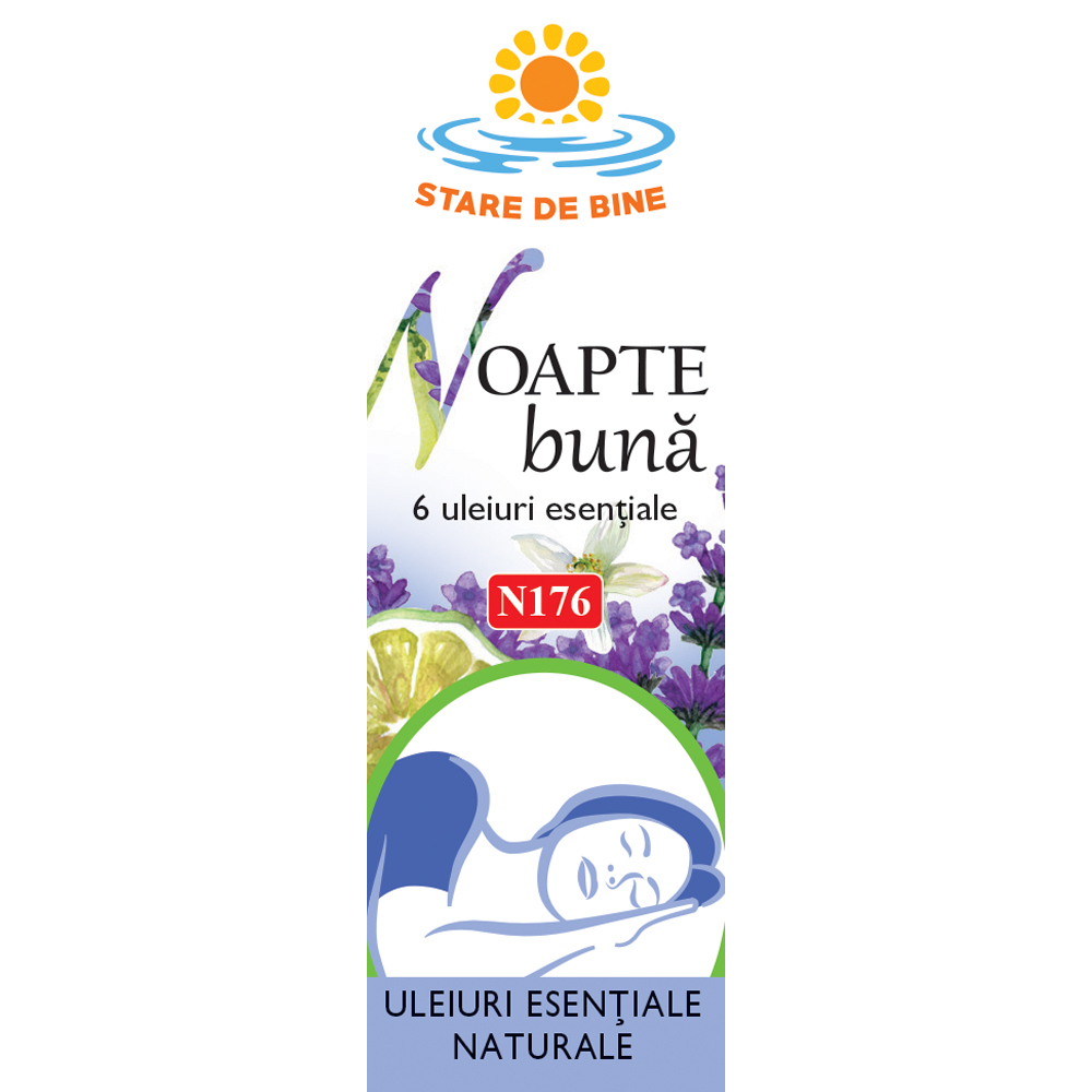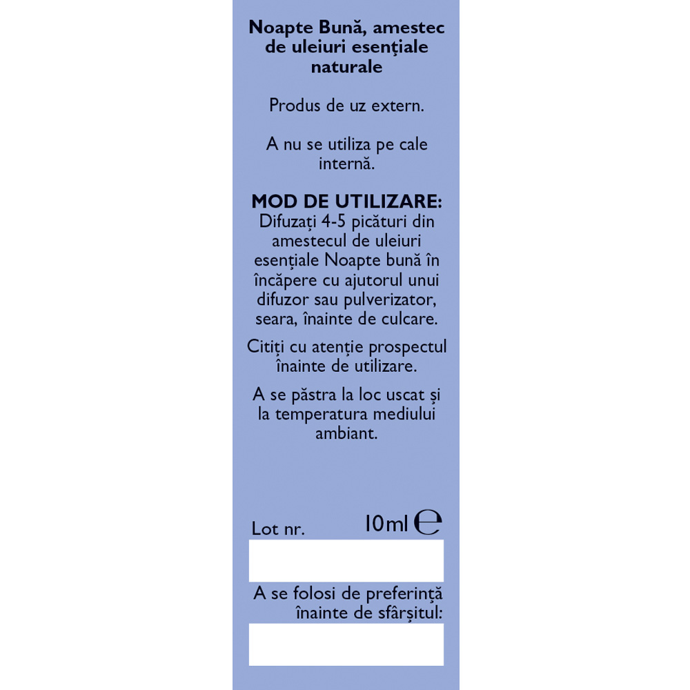 Difuzați 4-5 picături din amestecul de uleiuri esențiale Noapte Bună în încăpere, cu ajutorul unui difuzor sau pulverizator, seara, înainte de culcare.