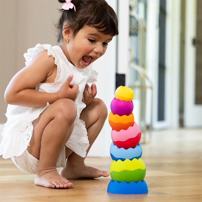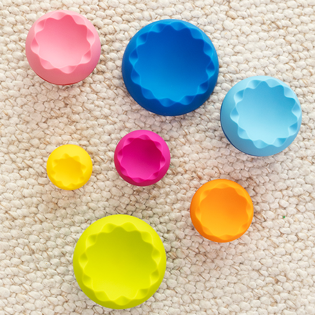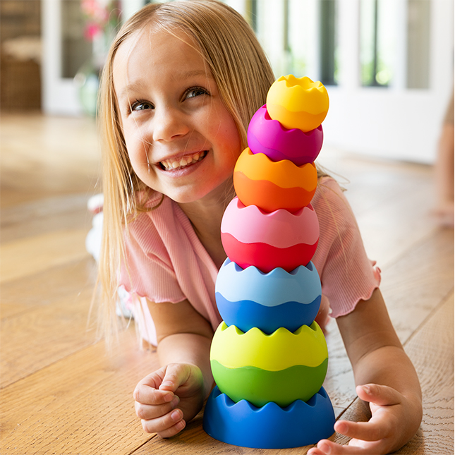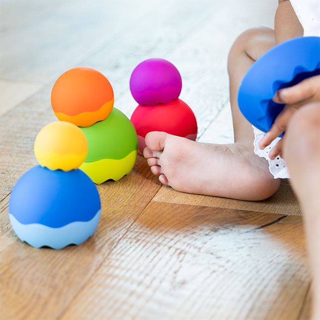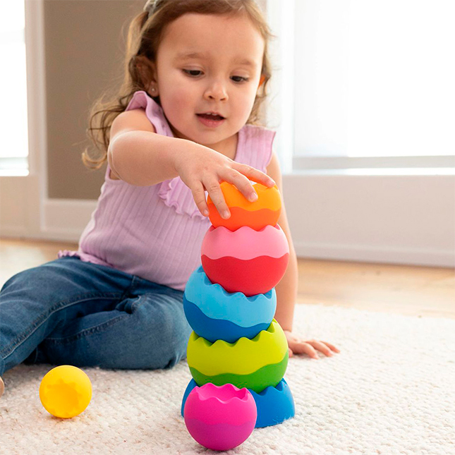Turnul de bile pentru stivuit și echilibru combină culorile vesele cu principiile fizicii și o textură tactilă plăcută, oferind copiilor o experiență senzorială completă. Cei mici se pot distra stivuind, dărâmând și echilibrând piesele în moduri diferite, descoperind cum greutatea și forma influențează mișcarea. Jucăria stimulează imaginația, coordonarea și curiozitatea naturală, oferind ore întregi de joacă creativă.