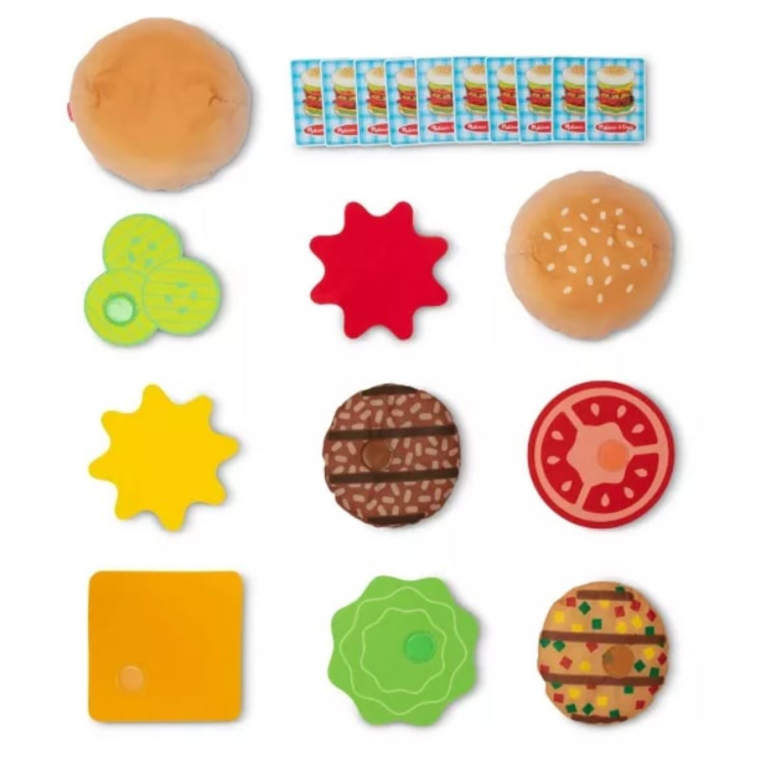 Joaca jocuri de potrivire si stivuire cu ingrediente de burger din tesatura supradimensionata si 2 manusi de burger jumbo.