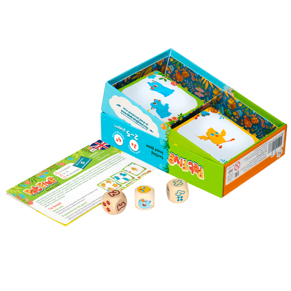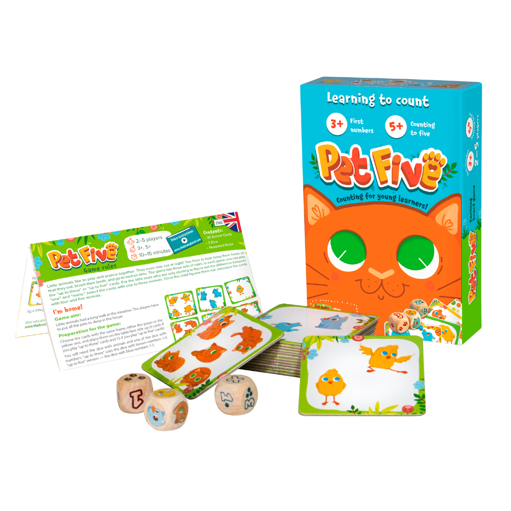 PET FIVE este un joc educativ inteligent conceput pentru a stimula gandirea logica, atentia si abilitatile cognitive ale copiilor. Realizat din hartie si carton de calitate, jocul include 30 de carti cu animale, 3 zaruri si regulile de joc, oferind multiple variante si niveluri de dificultate adaptate diferitelor grupe de varsta. Fiecare partida dureaza aproximativ 10–15 minute, fiind perfecta pentru joc rapid, interactiv si plin de invatare. PET FIVE ii ajuta pe cei mici sa isi dezvolte abilitatile de numarare, sa compare cantitati si sa exerseze memoria, intr-un mod distractiv si usor de inteles.