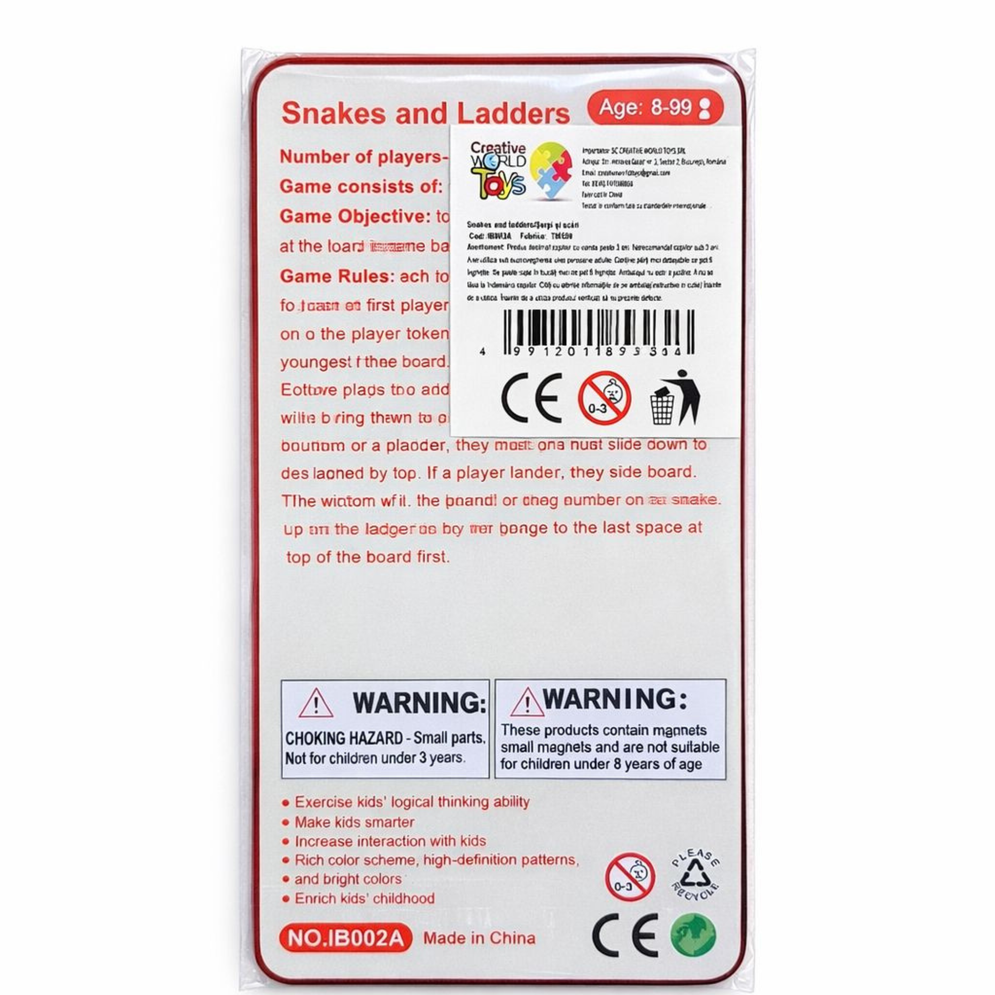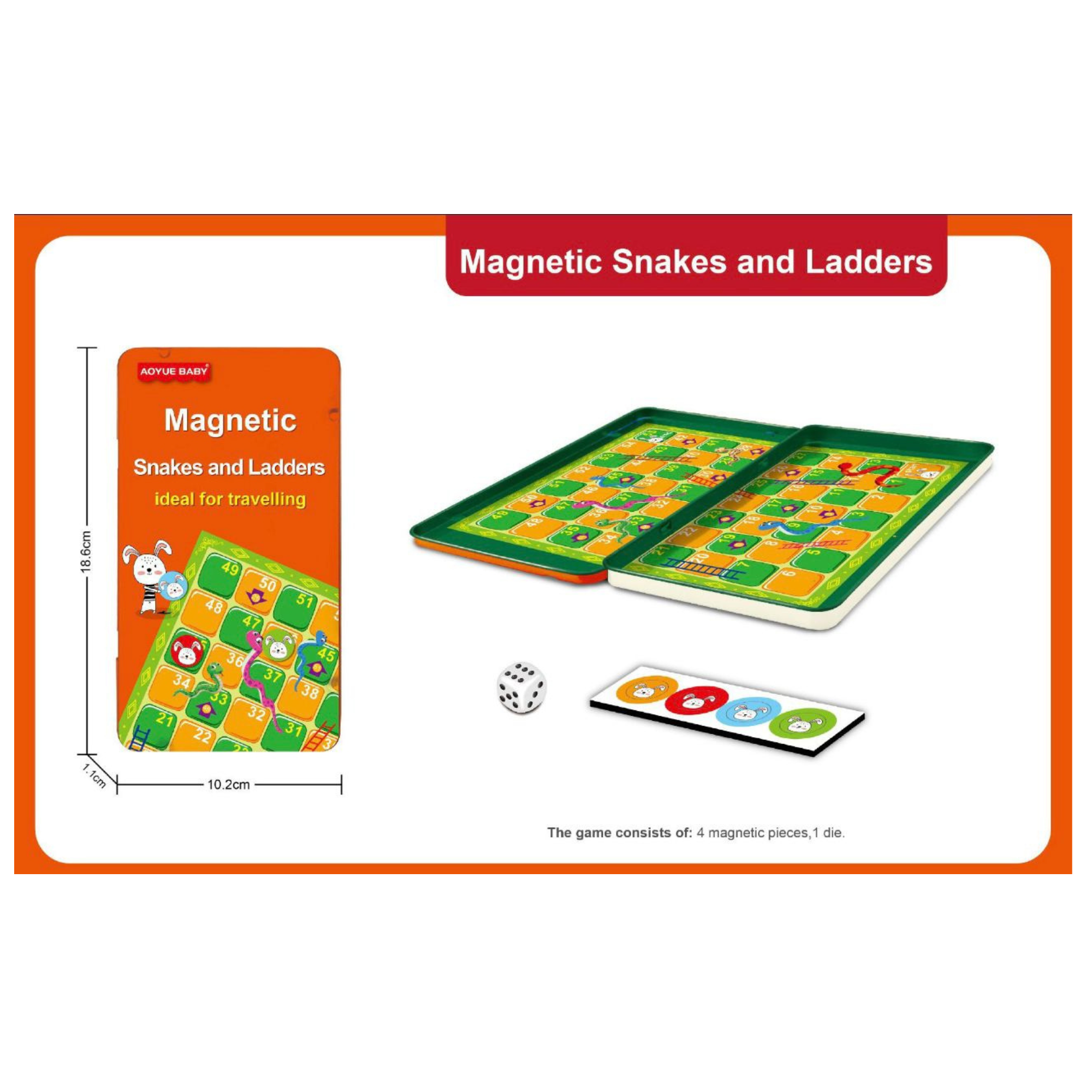 Joc clasic și distractiv „Șerpi și scări”, în variantă compactă cu piese magnetice. Ideal pentru călătorii și pentru momentele de relaxare în familie. Tabla pliabilă și piesele magnetice asigură stabilitate și ușurință în utilizare oriunde.