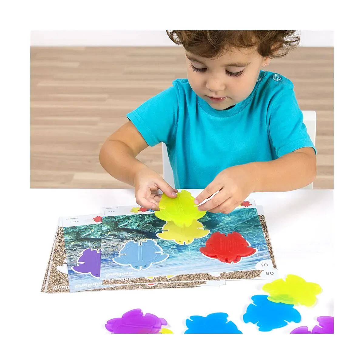 Translucent Math Turtles este un set educativ produs de Miniland, conceput pentru a îmbina jocul și învățarea matematică. Pe lângă introducerea copiilor în concepte de numărare și diferențiere de culori, setul stimulează orientarea spațială, recunoașterea modelelor și primele noțiuni de topologie. Este potrivit pentru joc pe mese luminoase (light tables).