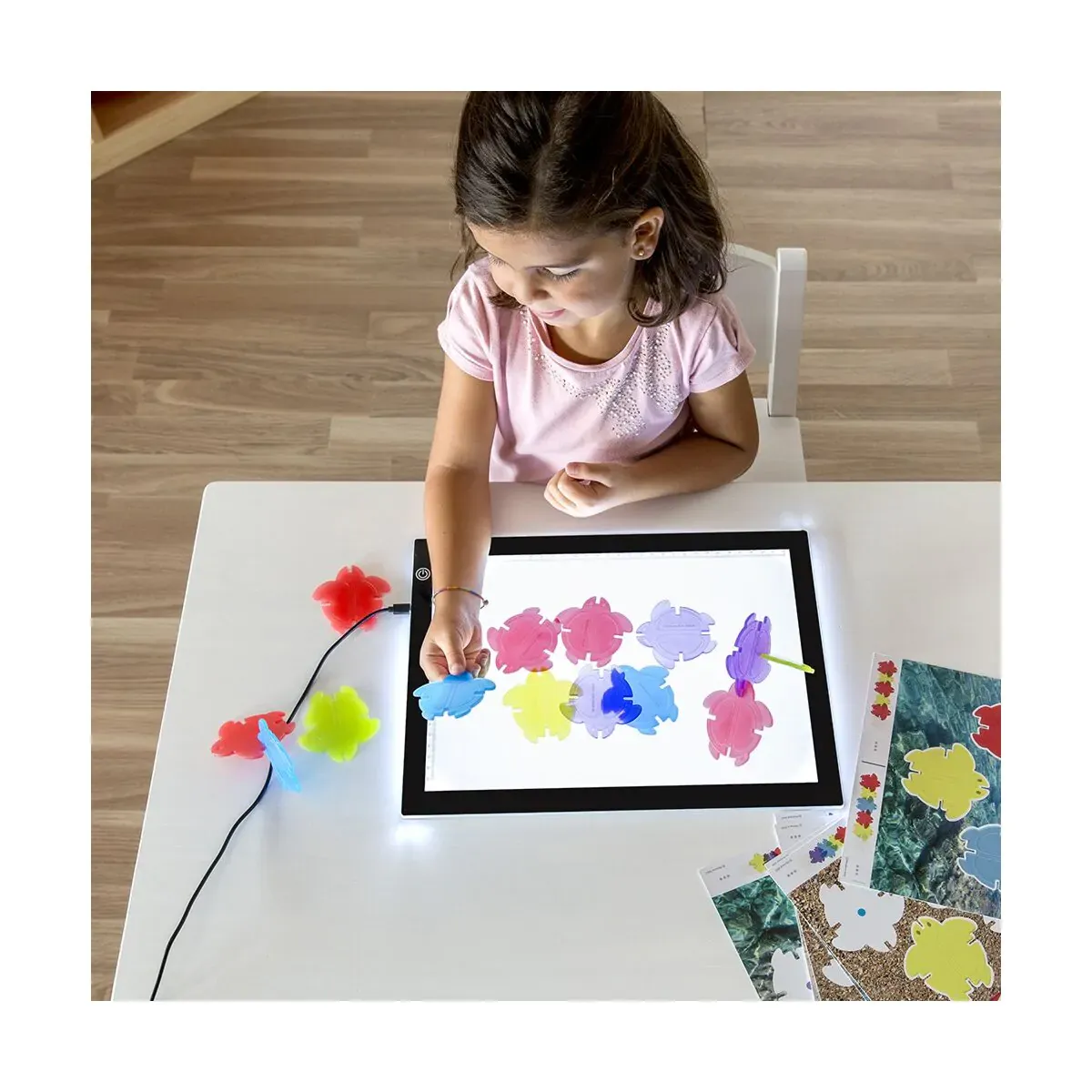 Jocul contine un set de 20 de țestoase translucide și 9 cărți de activitate cu două niveluri de dificultate.