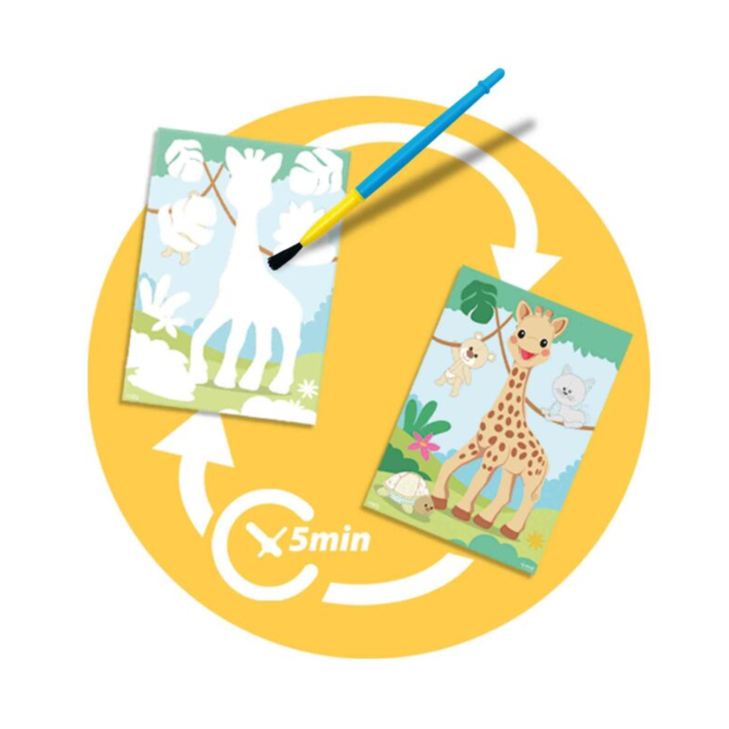 Descoperă magia picturii cu apă alături de Girafa Sophie! Acest set educativ de la SES Creative este ideal pentru copiii mici, oferind distracție fără murdărie. Cele 4 planșe reutilizabile prind viață atunci când sunt atinse cu pensula umedă, dezvăluind desene colorate ca prin magie. După uscare, imaginile dispar și copilul poate reîncepe joaca de fiecare dată. O activitate simplă, sigură și captivantă, ce stimulează imaginația și coordonarea celor mici!