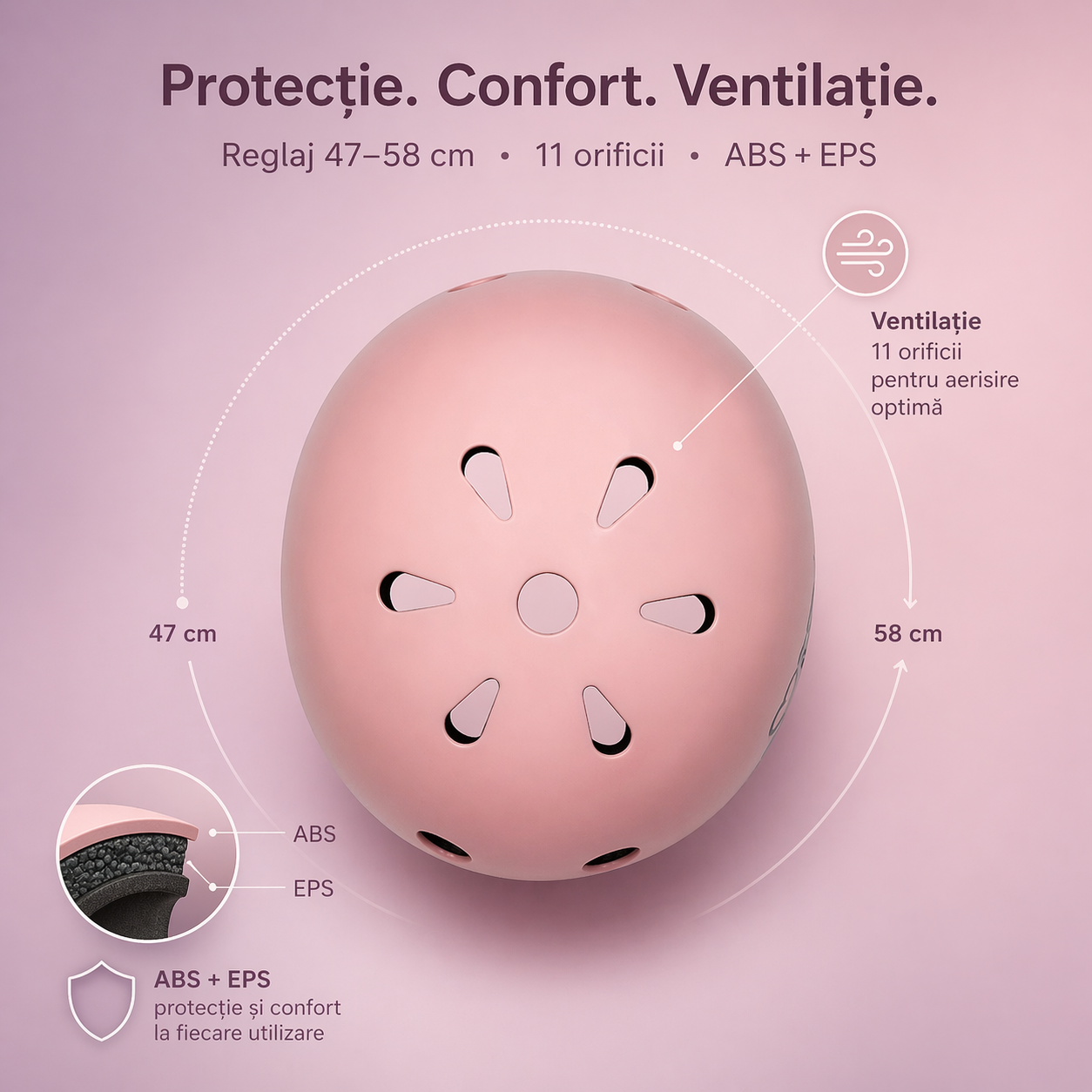 Casca copii bicicletă MIMI, 47-58 cm, roz mat, MoMi este gândită pentru situațiile în care siguranța copilului trebuie să rămână clară și ușor de gestionat. Carcasa ABS, interiorul EPS, reglajul pentru circumferința capului și cele 11 orificii de aerisire fac modelul potrivit pentru plimbări cu bicicleta, scuterul sau rolele.