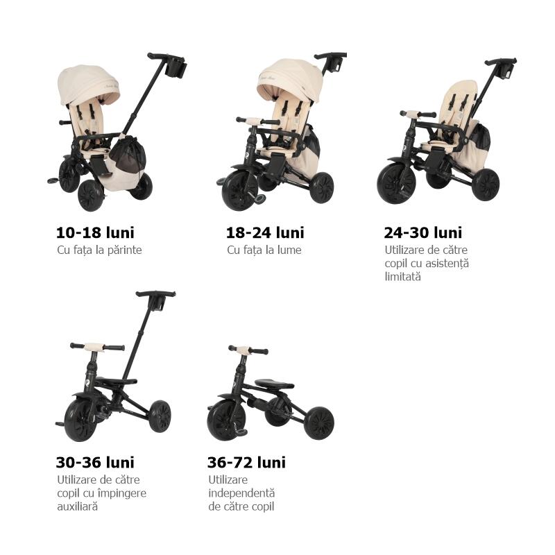 Tricicleta ultrapliabila Qplay Nova MAX este o tricicletă modulară premium, proiectată pentru a însoți copilul pe termen lung, de la primele plimbări asistate, în jurul vârstei de 10 luni, până la aproximativ 6 ani. Datorită conceptului evolutiv inteligent, aceasta se adaptează ușor fiecărei etape de dezvoltare, transformându-se progresiv din tricicletă cu control parental într-un model independent pentru copil.