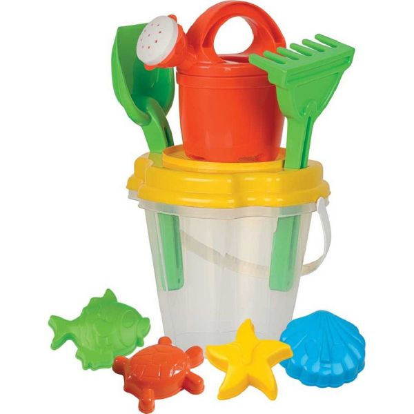 Conținut pachet: 1 găleată cu sită, 1 stropitoare, 1 lopată, 1 greblă, forme pentru nisip