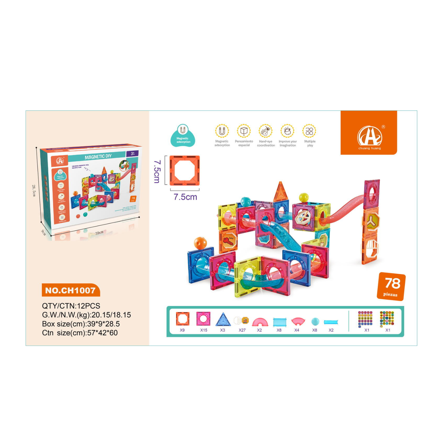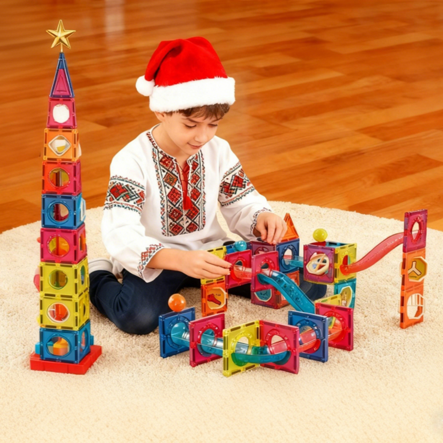 Piesele magnetice se îmbină pentru a construi trasee și labirinturi pentru biluțe. Copiii pot crea structuri 3D și pot testa diferite configurații pentru a ghida bilele pe trasee variate.
