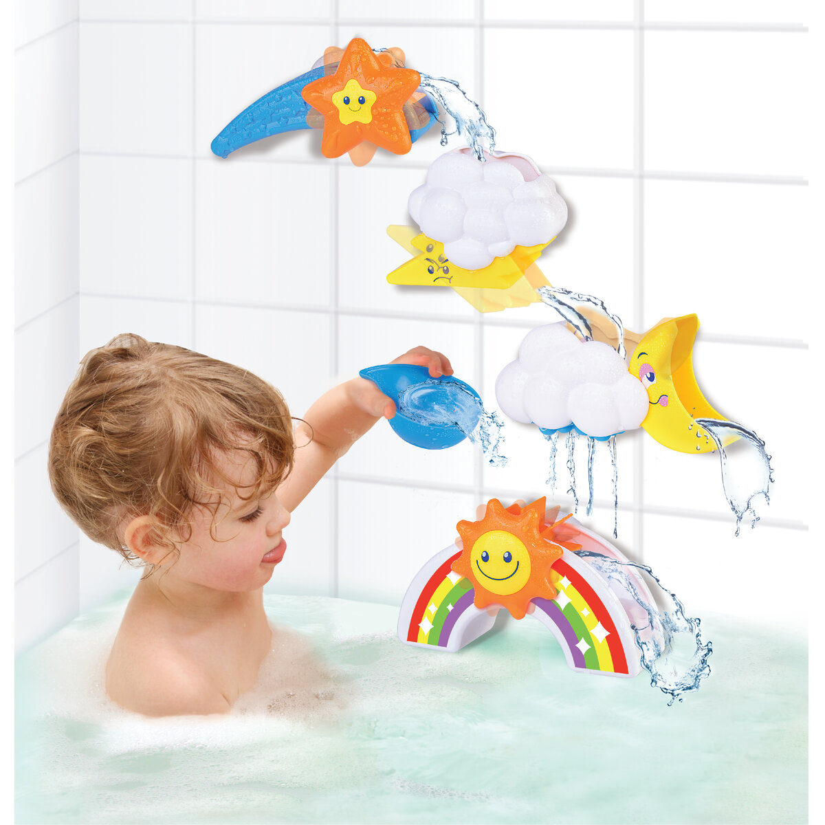Jucarie pentru baie – Vremea transforma baita zilnica intr-o experienta distractiva si educativa. Jucaria se ataseaza usor pe peretii baii cu ajutorul ventuzelor, iar atunci cand torni apa peste elementele meteorologice, ia nastere o mica cascada interactiva. Morisca se invarte rapid sub jetul de apa, captand atentia copilului si stimuland curiozitatea acestuia.