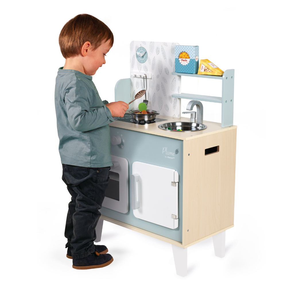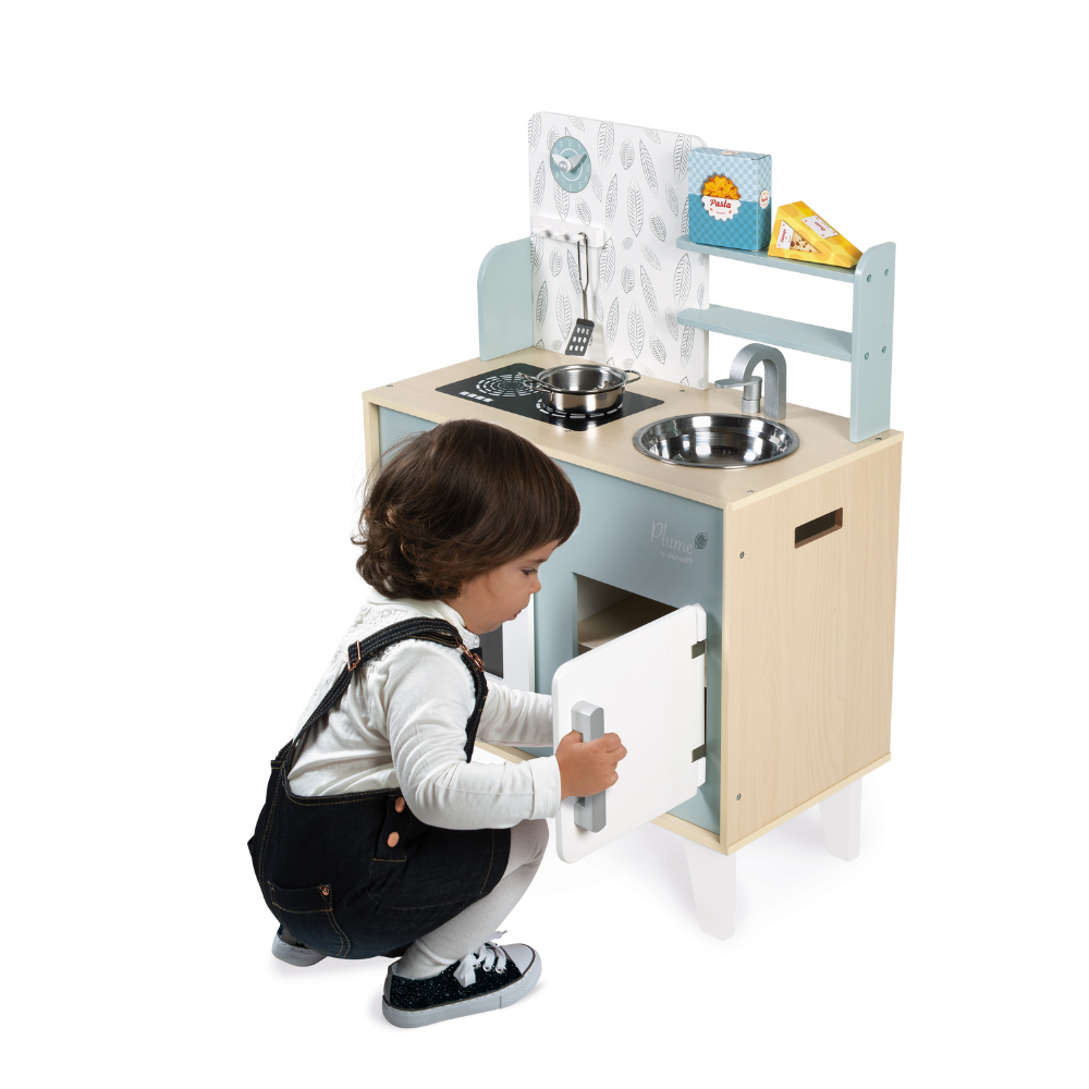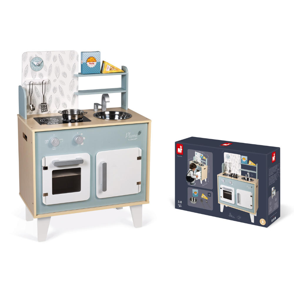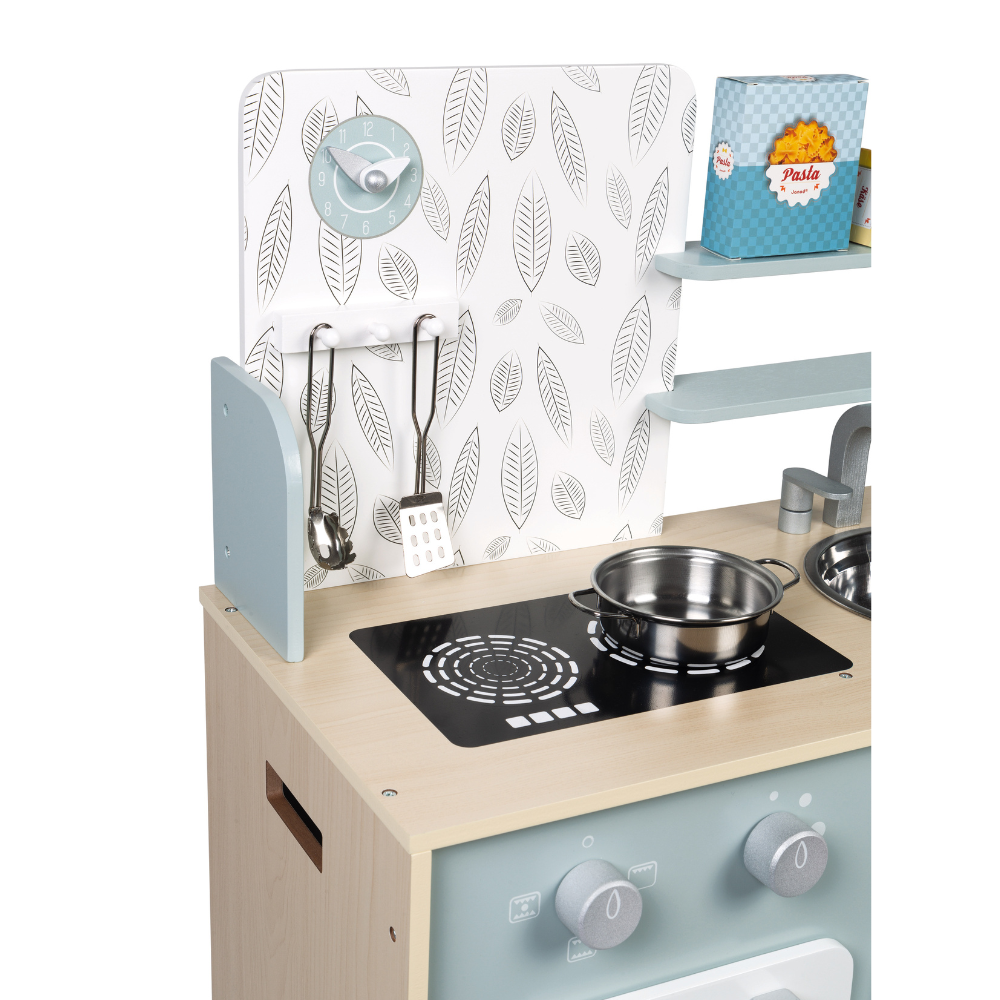 Grăbește-te! Totul începe în bucătărie – pregătește masa perfectă pentru mama și tata! Această bucătărie din lemn, decorată în nuanțe delicate de albastru și gri, oferă copiilor o experiență de joacă realistă și creativă.
