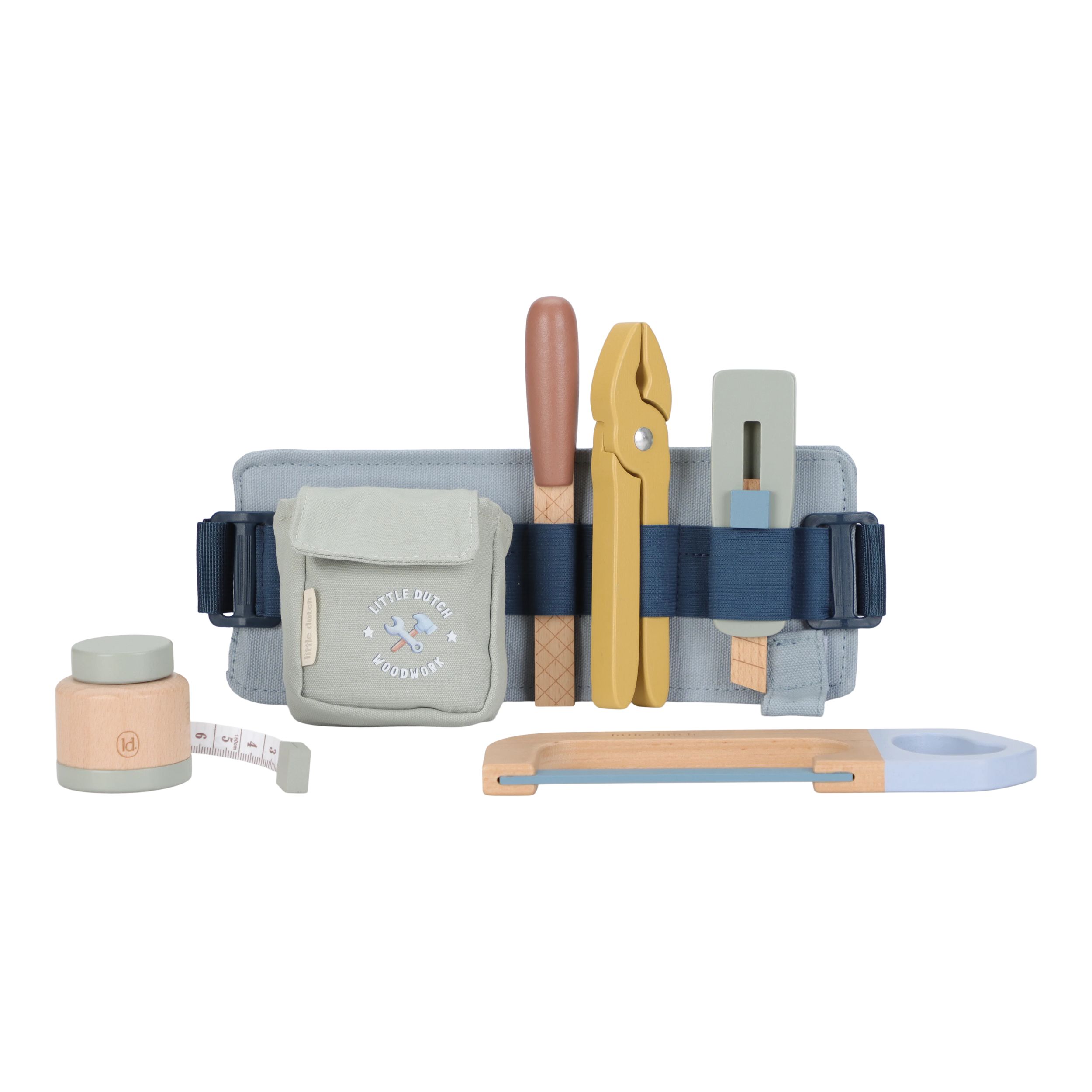 Pentru micii constructori, aceasta centura cu unelte din lemn este un accesoriu indispensabil! Centura este reglabila, se potriveste confortabil si este echipata cu cinci unelte esentiale: ciocan, surubelnita, cheie si altele.