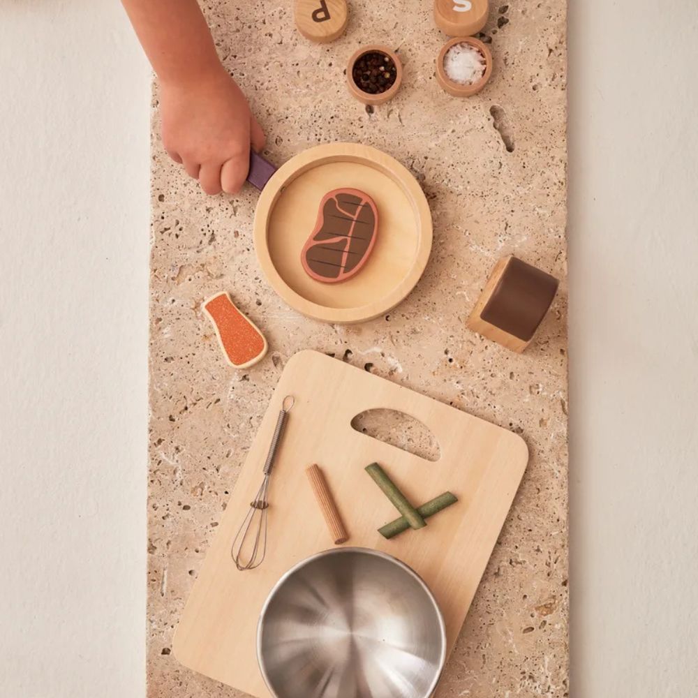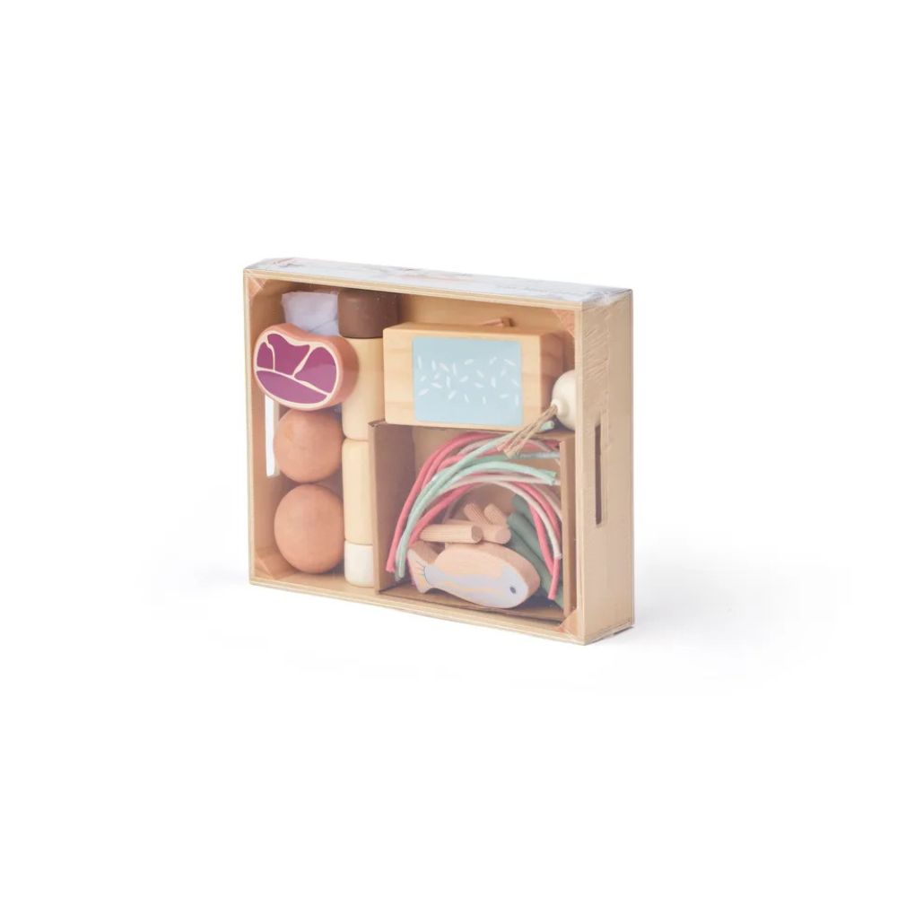 Setul din lemn Alimente bucătărie transformă joaca într-o experiență creativă și educativă. Copiii pot recrea scene din viața de zi cu zi, precum jocuri de-a bucătăria, magazinul sau restaurantul, învățând despre alimente, culori și forme într-un mod distractiv.