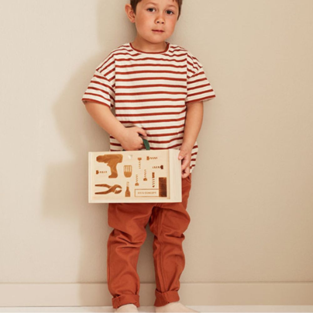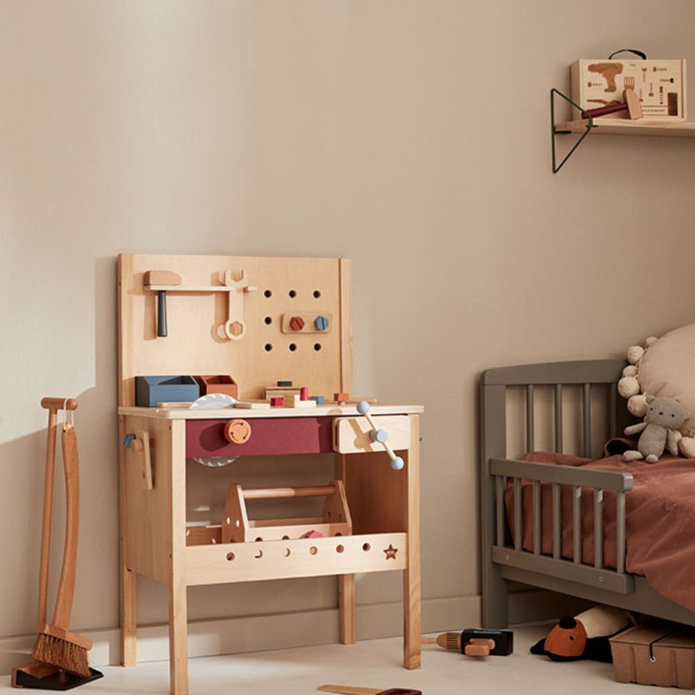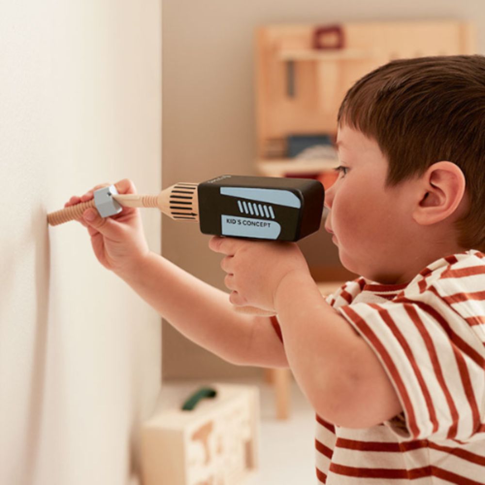 Setul include o cutie cu scule din lemn certificat FSC, precum și piese interschimbabile care transformă rapid burghiul într-o șurubelniță. Copiii pot exersa mișcările reale de înșurubare și demontare, dezvoltându-și coordonarea și gândirea practică.
