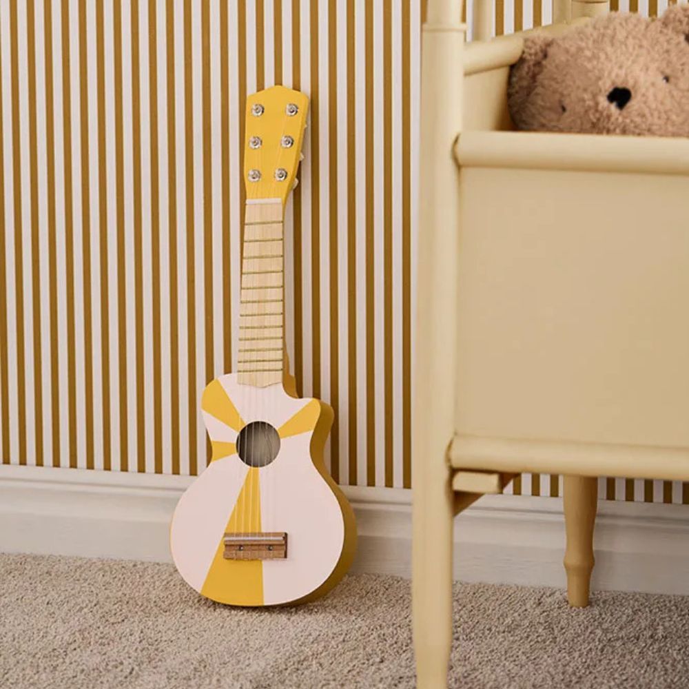 Chitara din lemn Yellow White este creată pentru micii muzicieni care adoră sunetele și ritmul. Cu un design elegant și culori vesele, acest instrument le oferă copiilor posibilitatea de a descoperi plăcerea de a cânta și de a-și exprima creativitatea.