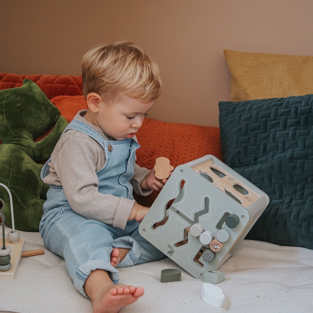 Realizat din lemn de calitate, cubul are un design atractiv în nuanța olive green, fiind potrivit atât pentru joacă, cât și ca element decorativ în camera copilului.
