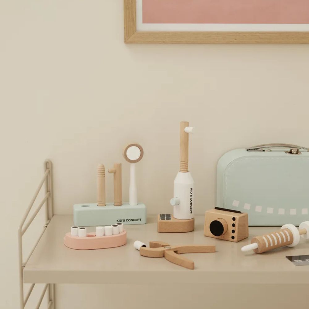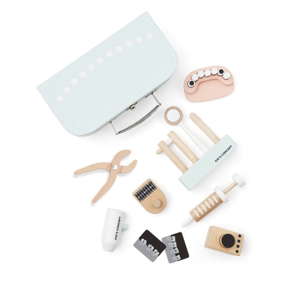 Setul include diverse instrumente de consultație și tratament dentar, realizate din lemn și alte materiale durabile, precum MDF, metal, acrilic și carton, precum și radiografii din hârtie pentru un plus de realism.