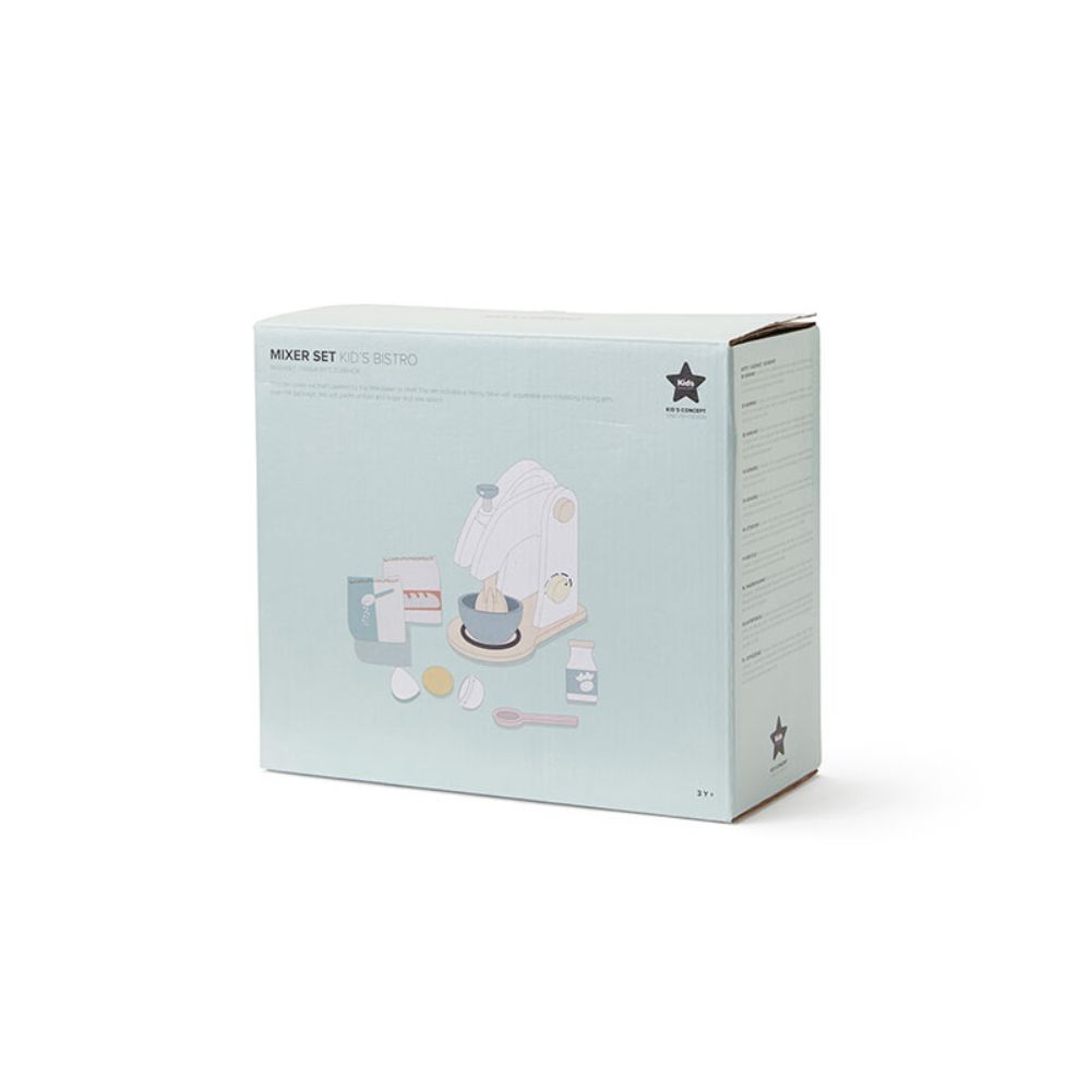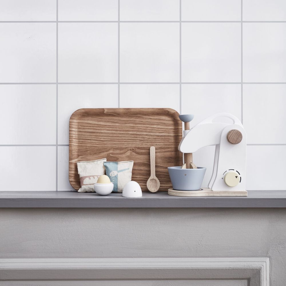 Fabricat din lemn robust (MDF) și materiale textile precum bumbac și poliester, acest mixer are un design atractiv și o construcție solidă, ideală pentru jocul zilnic. Mânerul mobil și detaliile realiste stimulează imaginația și coordonarea mână–ochi.