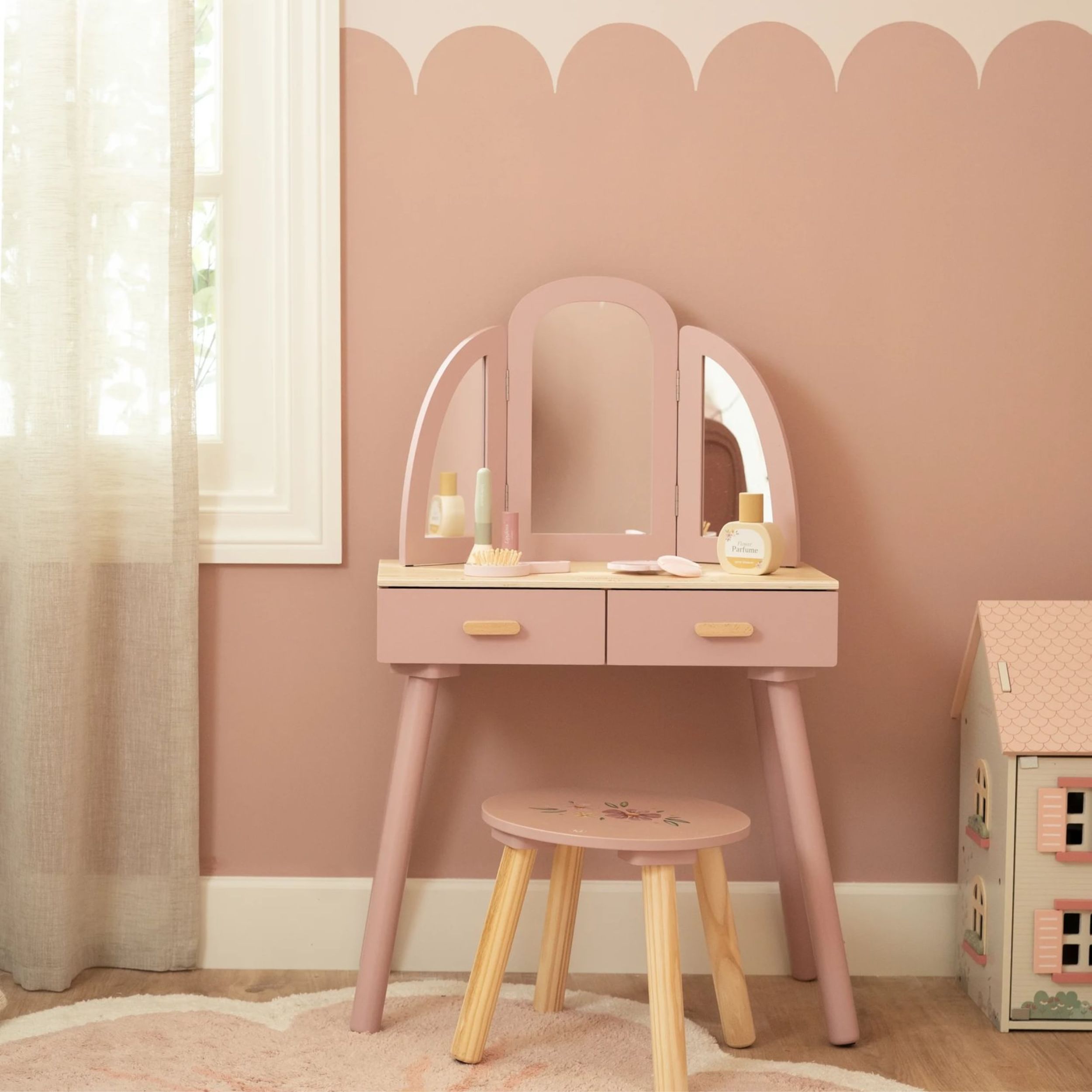 Simte-te ca o adevarata printesa cu aceasta masuta de toaleta roz din lemn, eleganta si plina de farmec! Oglinda cu trei panouri ii permite copilului sa se admire din toate unghiurile, iar sertarele incapatoare sunt perfecte pentru a pastra toate accesoriile preferate.