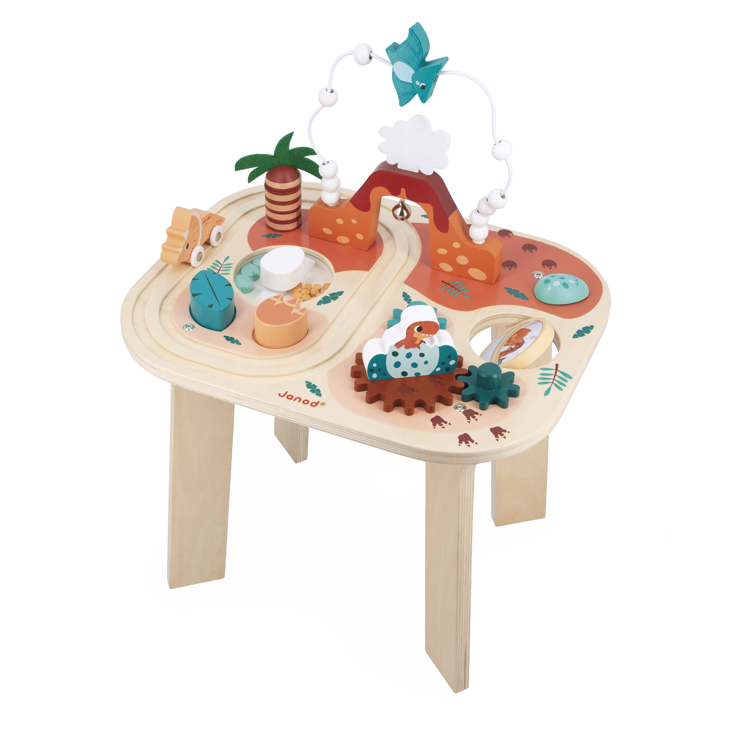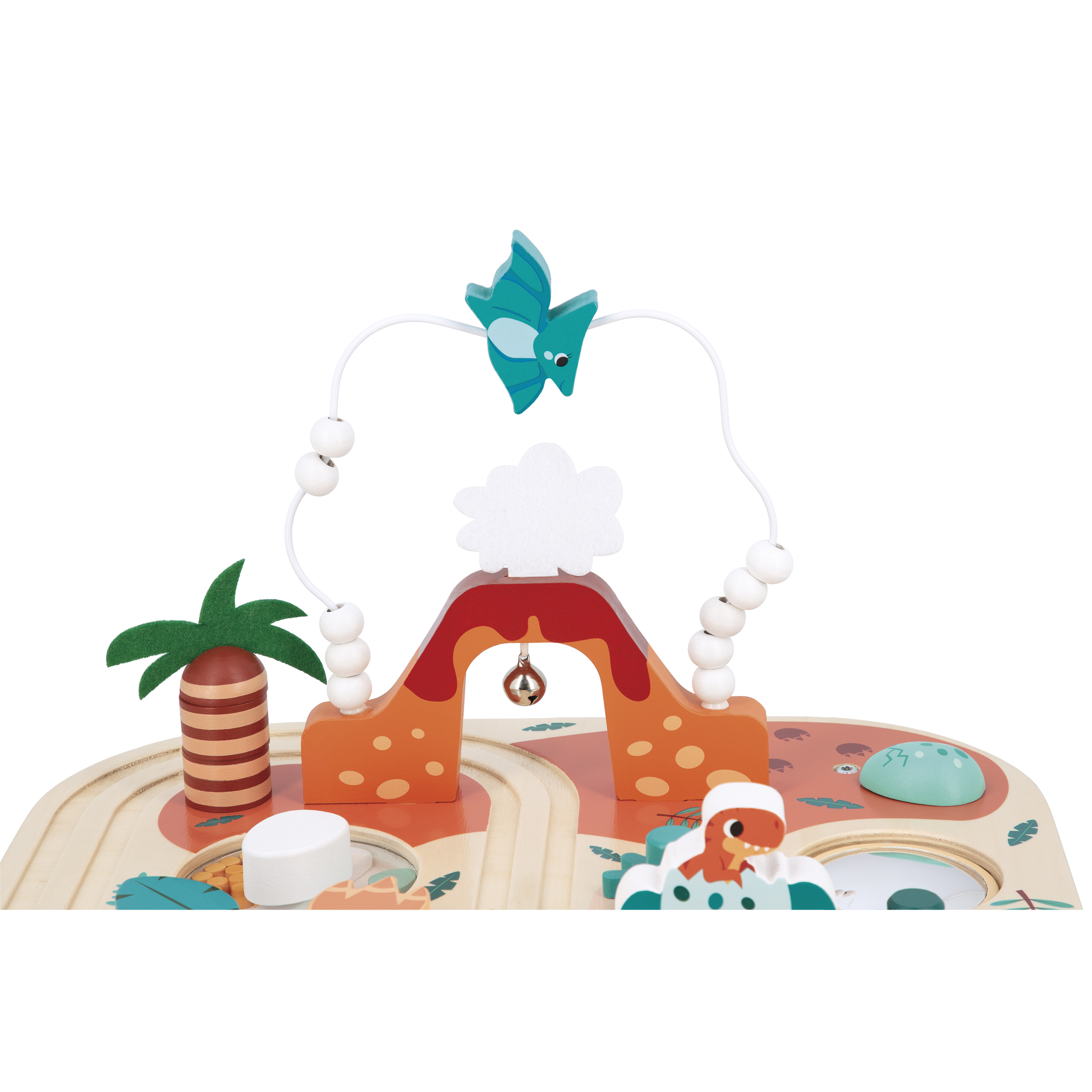 Copiii vor descoperi un univers fascinant cu dinozauri prietenoși, un vulcan care erupe, un ou rotativ și un sistem de roți dintate. Măsuța include și un triceratops pe roți, un abac cu 10 mărgele, un pteranodon zburător, o jucărie de stivuit în formă de palmier, precum și piese din lemn în formă de urme și frunze.