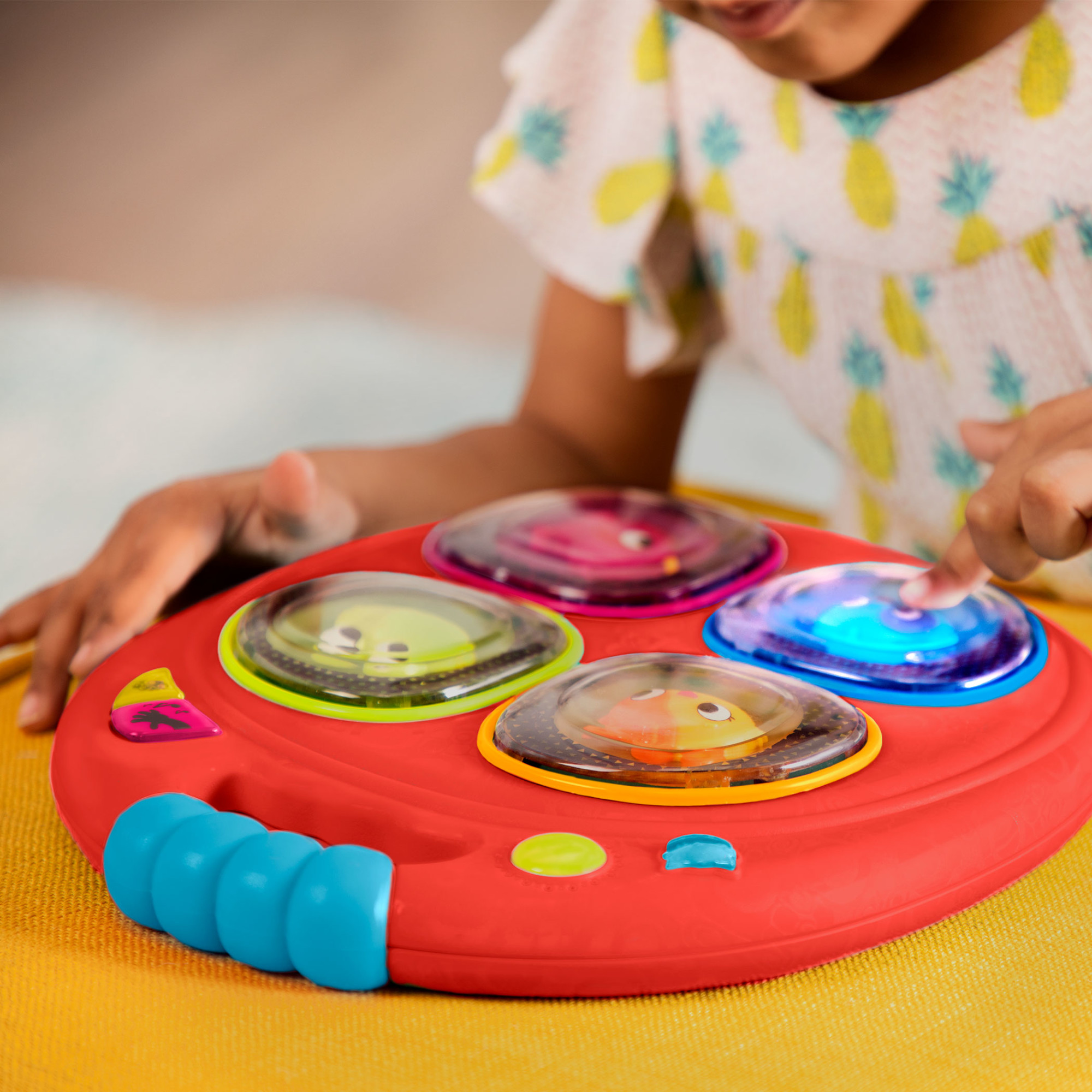 Selectați modul de joc dorit și încurajați copilul să interacționeze cu butoanele pentru a descoperi sunete, melodii și provocări de memorie.