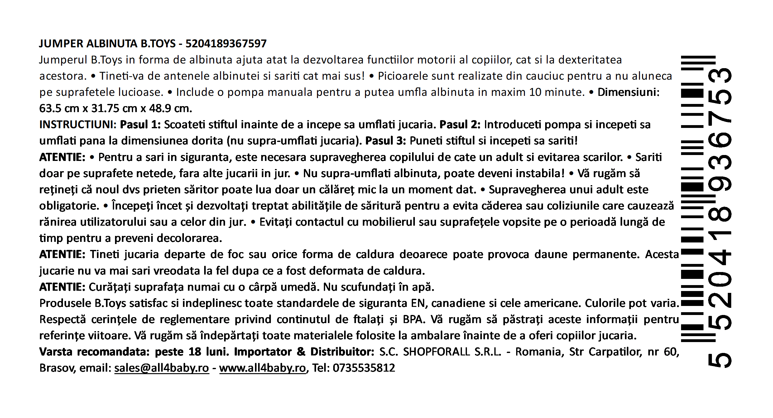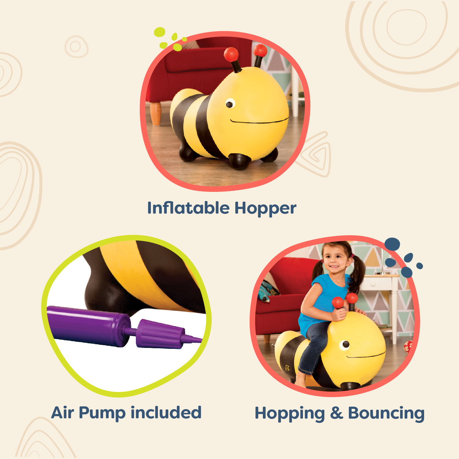 Transformă joaca într-o experiență plină de energie și distracție! Jumperul în formă de albinuță de la B.Toys este ideal pentru copiii activi, ajutând la dezvoltarea echilibrului, coordonării și motricității, în timp ce cei mici se distrează sărind în voie.