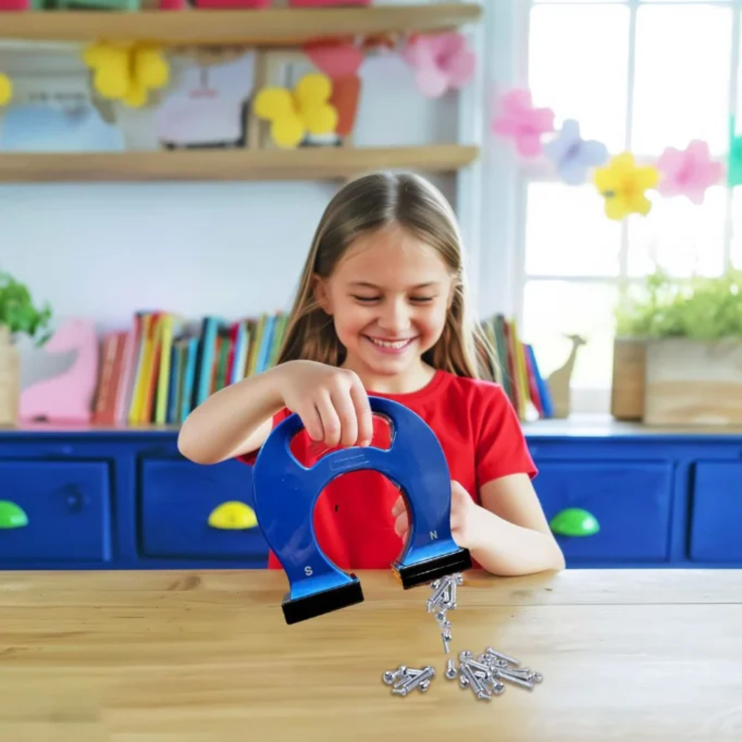 Acest magnet gigant KidzLabs este un instrument educativ captivant și distractiv ce le permite copiilor să exploreze principiile magnetismului prin experimente practice. Datorită dimensiunilor sale generoase și formei clasice în potcoavă, oferă o privire clară asupra forțelor magnetice de atracție și respingere, demonstrându‑le copiilor cum acționează un magnet în lumea reală.