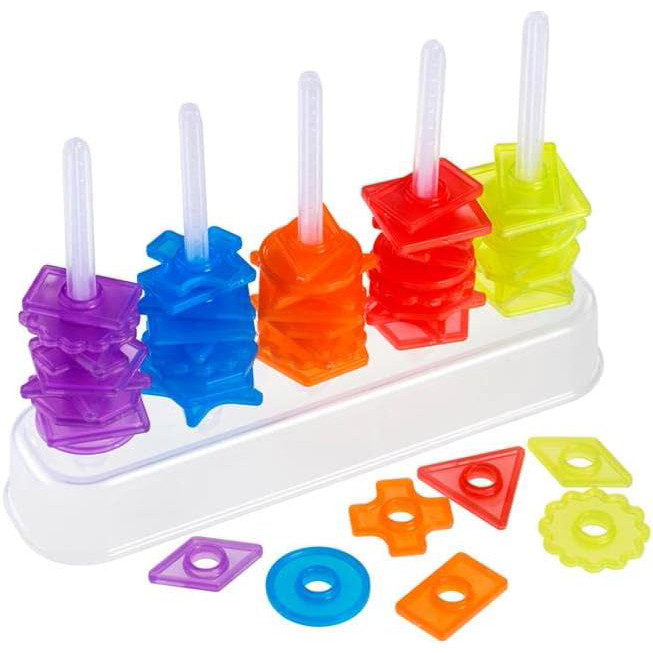 Acest abac colorat din plastic translucid este un instrument educativ distractiv și interactiv, ideal pentru copii între 3 și 6 ani. Cu o bază de 5 coloane și 50 de piese în culori și forme diferite, îi ajută pe cei mici să își dezvolte abilitățile de numărare, recunoaștere a formelor și coordonare mână–ochi, prin joc.
