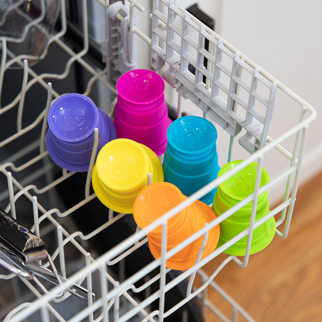Îmbogățește timpul de joacă al celor mici cu Suction Kupz, un set colorat și interactiv format din 6 cupe din silicon alimentar, prevăzute cu ventuze. Acestea se pot lipi pe orice suprafață netedă – pereți, ferestre, cadă, masă sau podea – oferind copiilor o modalitate distractivă de a explora, construi și învăța prin joacă. Fiecare cupă este moale, sigură și ușor de manevrat, fiind perfectă pentru dezvoltarea coordonării, a dexterității și a creativității celor mici.