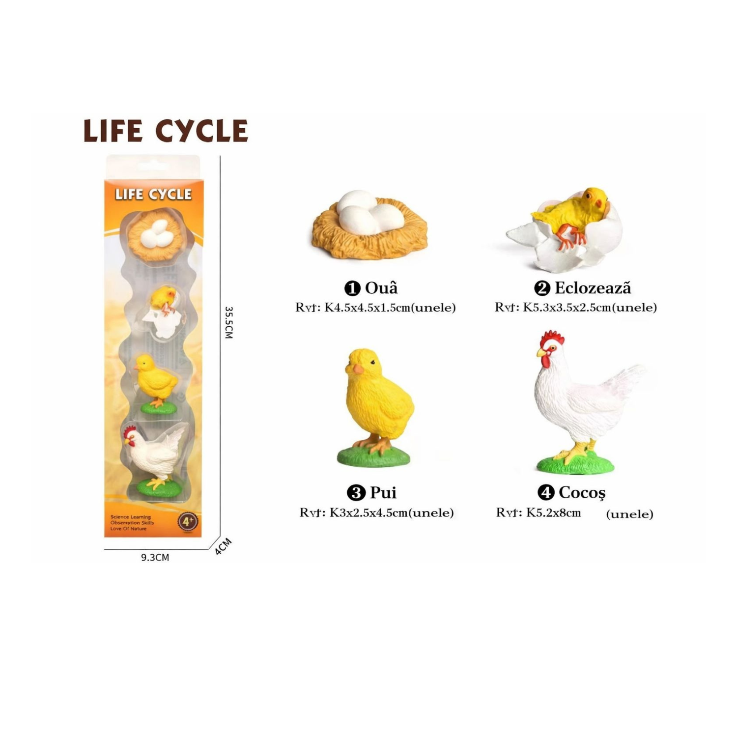 - 4 figurine reprezentând ciclul de viață al găinii: 1. Ouă 2. Eclozare (pui ieșind din ou) 3. Pui (găinușă) 4. Găină adultă