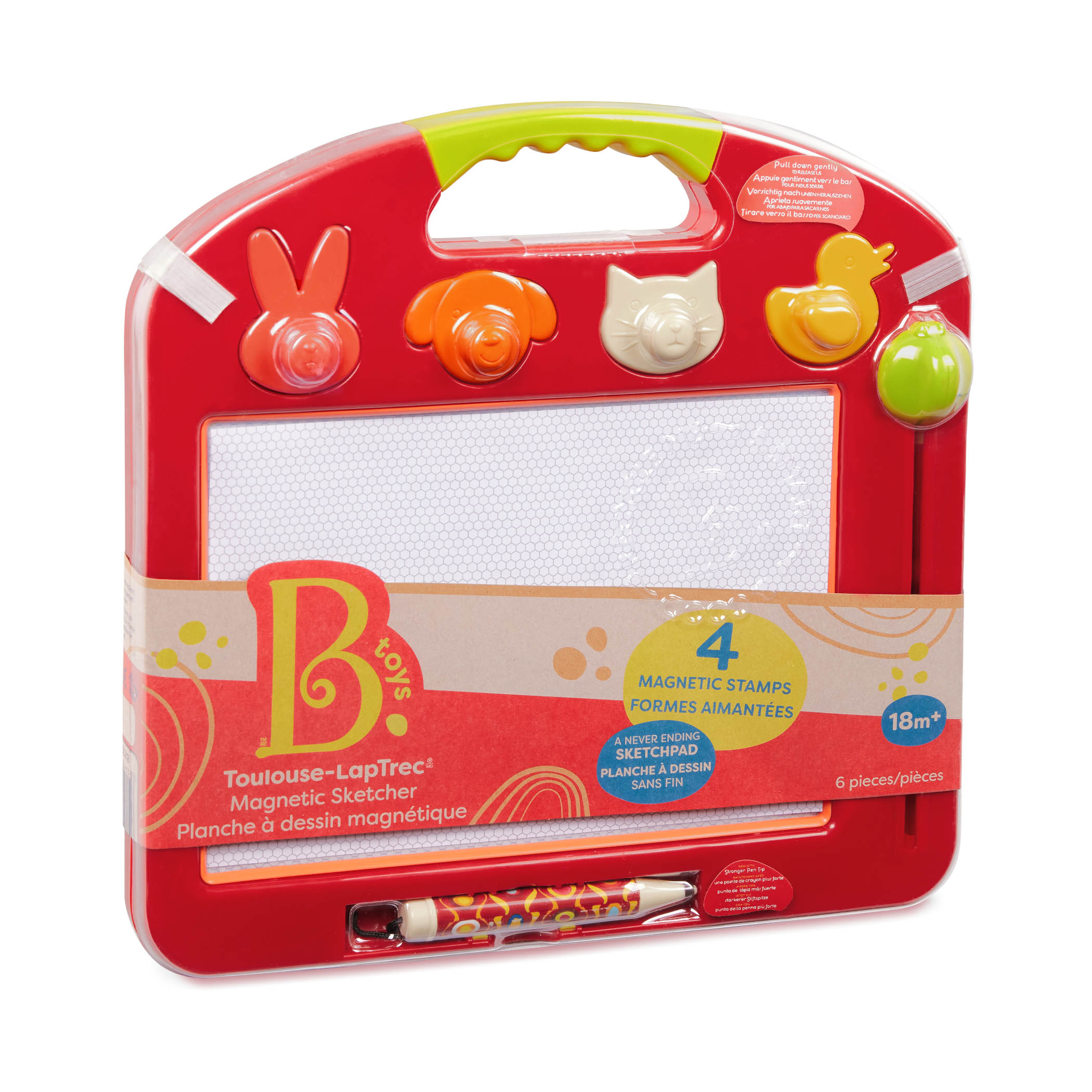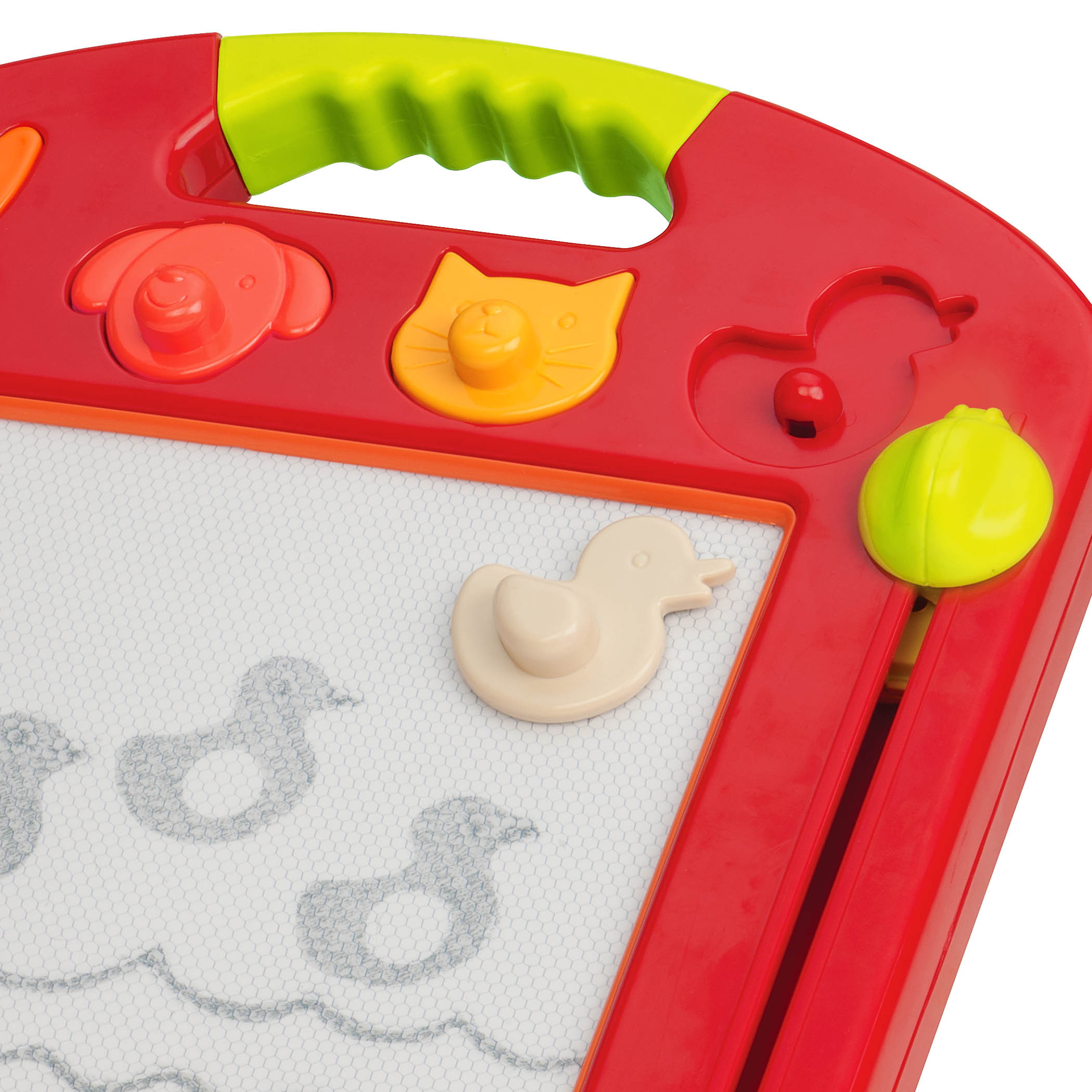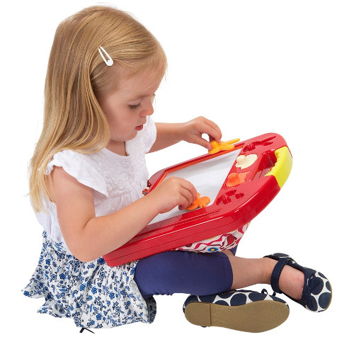 Tablă magnetică B.Toys permite copilului dvs să deseneze fără limite cu ajutorul stiloului special și a celor patru ștampile în formă de animăluțe.