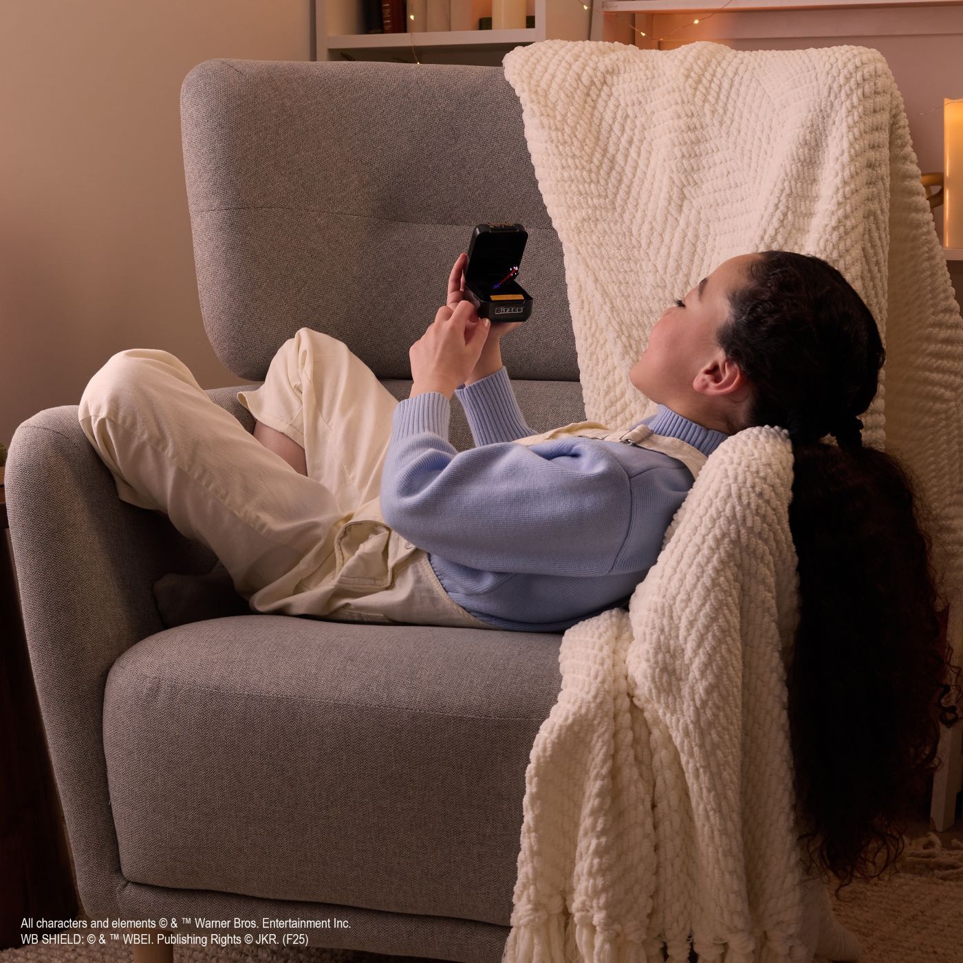 Această capsulă magică, elegant decorată în culorile Hogwarts – negru și auriu, ascunde o lume digitală plină de personaje, creaturi și aventuri interactive.