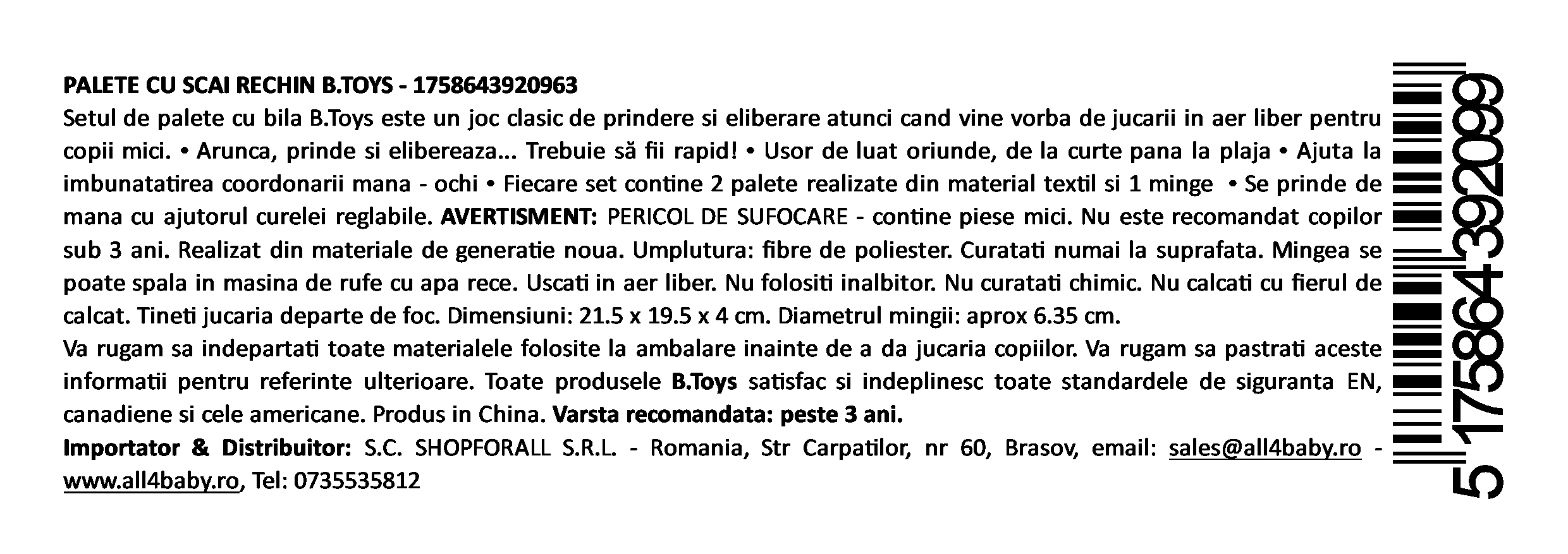 Setul de palete cu scai Rechin B.Toys este un joc clasic de prindere și aruncare, ideal pentru activități în aer liber. Conceput pentru copii, acest set contribuie la dezvoltarea coordonării mână–ochi și încurajează mișcarea și joaca activă într-un mod distractiv.
