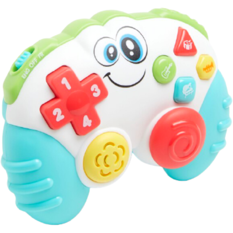 Copilul poate apăsa butoanele telecomenzii și ale consolei pentru a activa sunete, lumini și mesaje audio. Se poate selecta limba dorită și explora diferite funcții, sub supravegherea unui adult.
