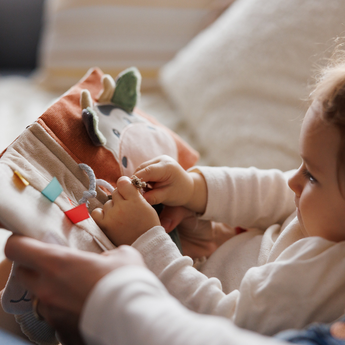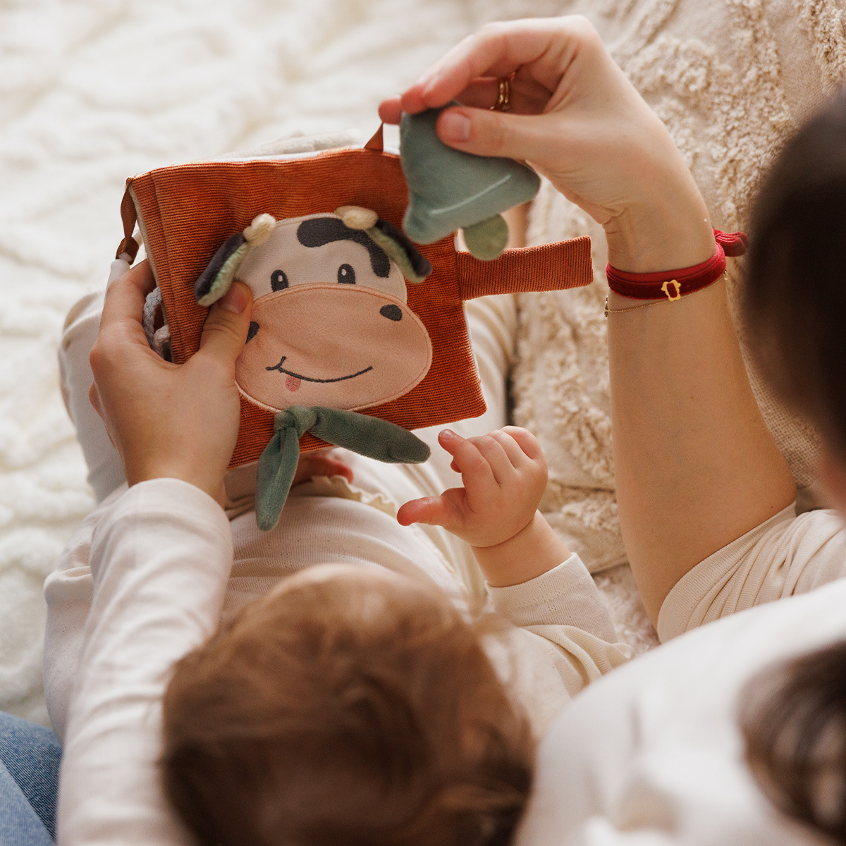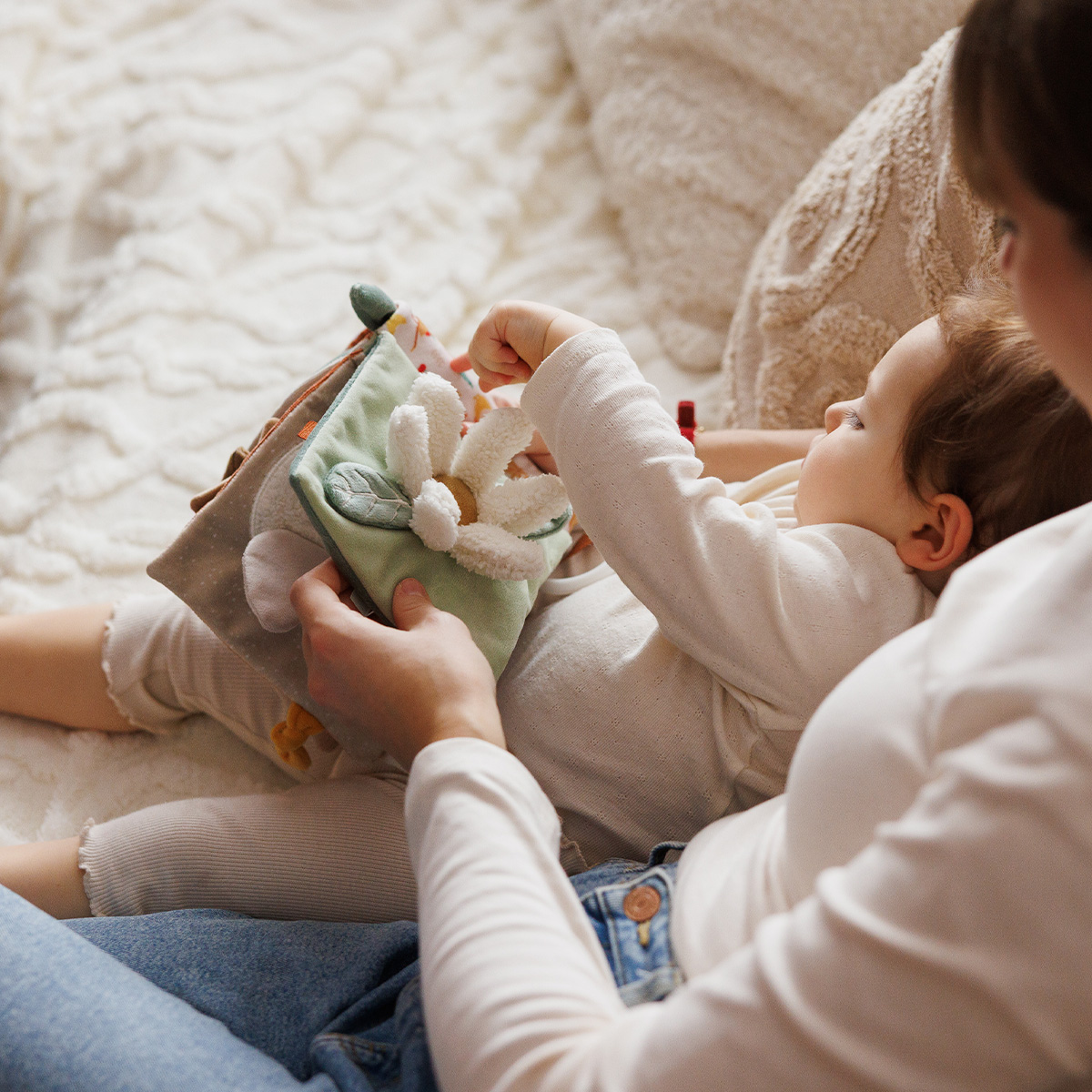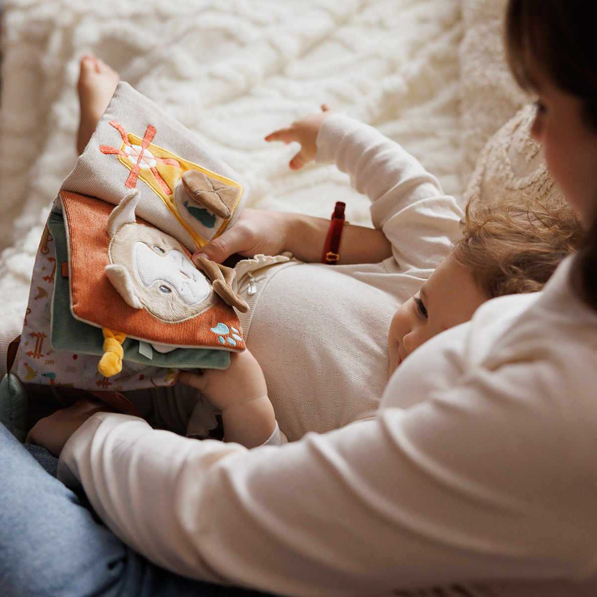 Texturile variate, culorile atractive și elementele interactive – precum oglinda, zornăitoarea și materialele fosnitoare – încurajează explorarea și descoperirea. Panglicile și nodurile ajută la exersarea prinderii, iar formatul moale și ușor este ideal pentru mânuțele mici. Datorită mânerului practic, cartea poate fi atașată cu ușurință la pătuț, cărucior sau scaun auto.