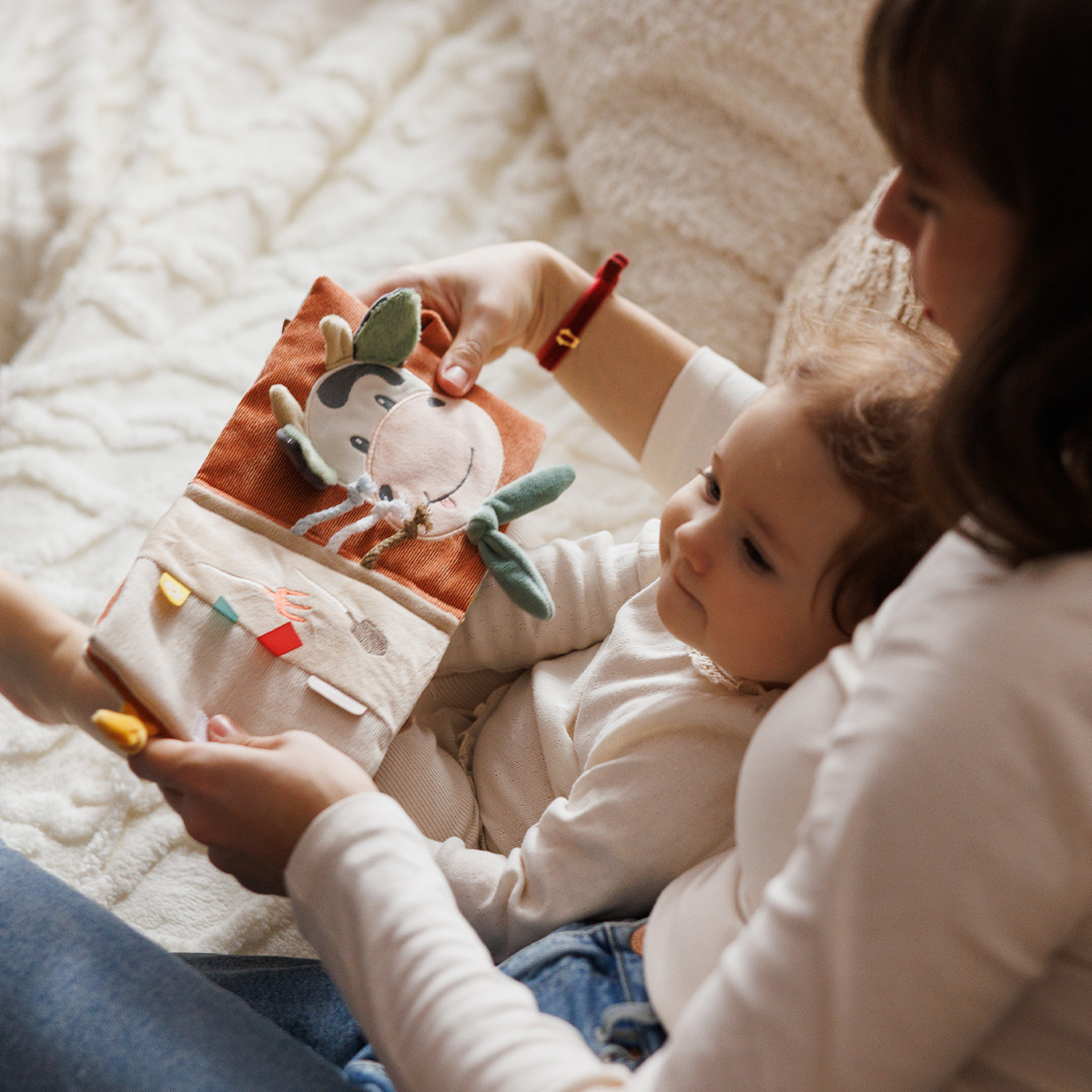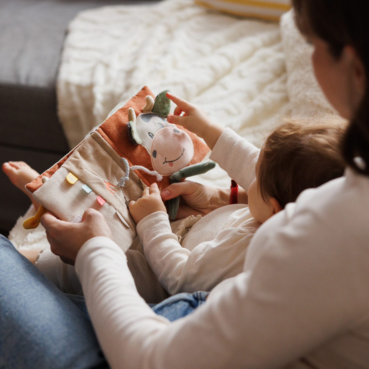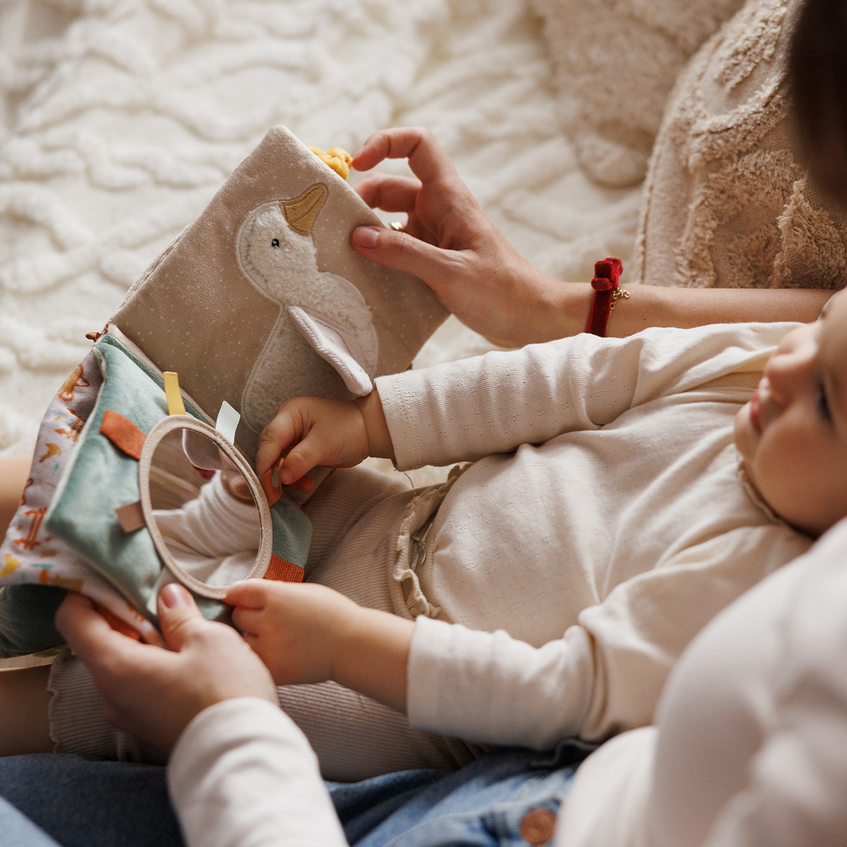 Texturile variate, culorile atractive și elementele interactive – precum oglinda, zornăitoarea și materialele fosnitoare – încurajează explorarea și descoperirea. Panglicile și nodurile ajută la exersarea prinderii, iar formatul moale și ușor este ideal pentru mânuțele mici. Datorită mânerului practic, cartea poate fi atașată cu ușurință la pătuț, cărucior sau scaun auto.