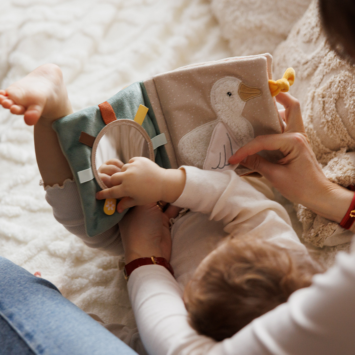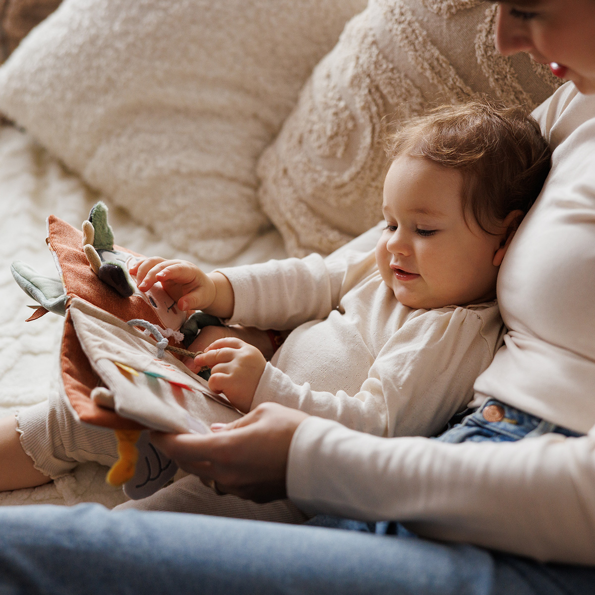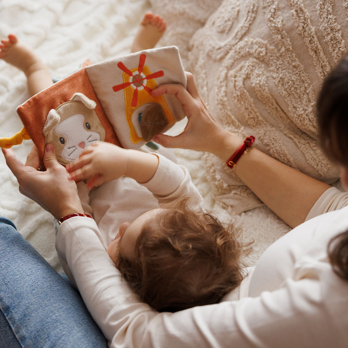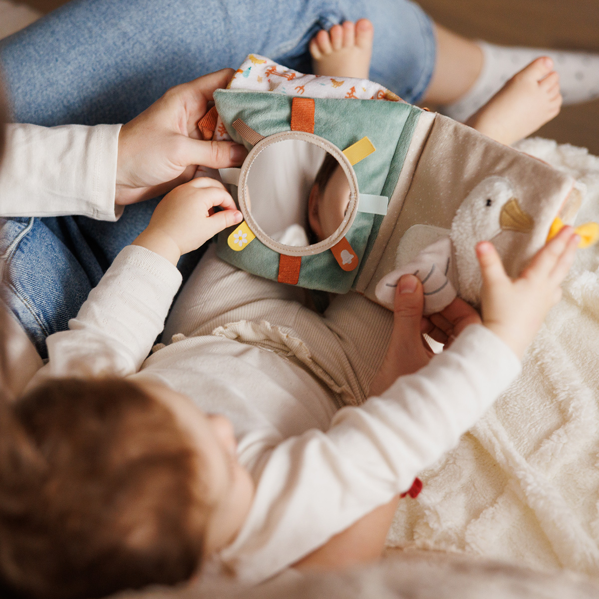 Texturile variate, culorile atractive și elementele interactive – precum oglinda, zornăitoarea și materialele fosnitoare – încurajează explorarea și descoperirea. Panglicile și nodurile ajută la exersarea prinderii, iar formatul moale și ușor este ideal pentru mânuțele mici. Datorită mânerului practic, cartea poate fi atașată cu ușurință la pătuț, cărucior sau scaun auto.