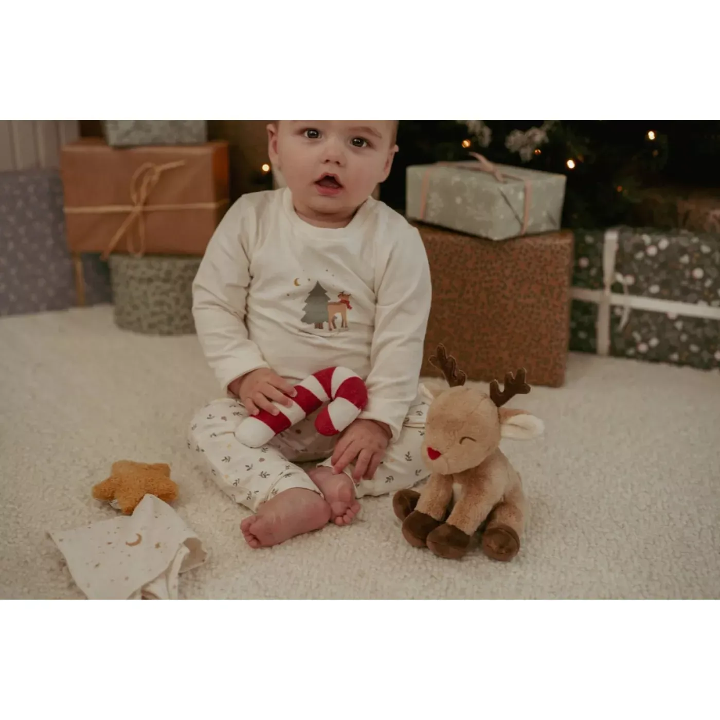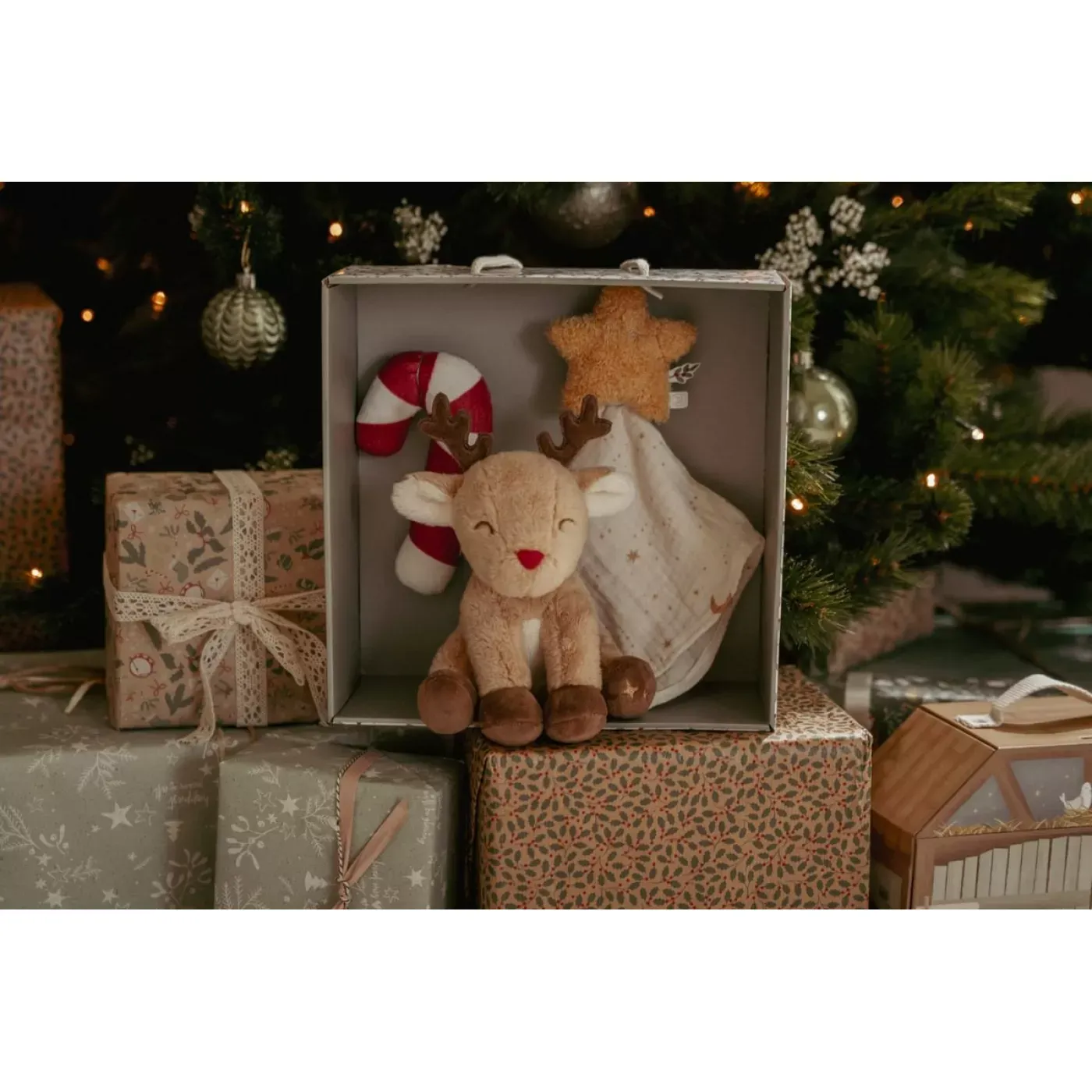 Surprinde un nou-născut în perioada sărbătorilor cu această cutie cadou de Crăciun, care conține trei jucării moi și adorabile: un păturică în formă de stea, o zornăitoare în formă de bastonaș de zahăr și un ren de pluș drăgălaș. Acest set festiv este perfect pentru primul Crăciun al bebelușului, oferind distracție, confort și amintiri de neuitat.