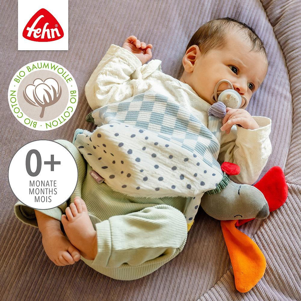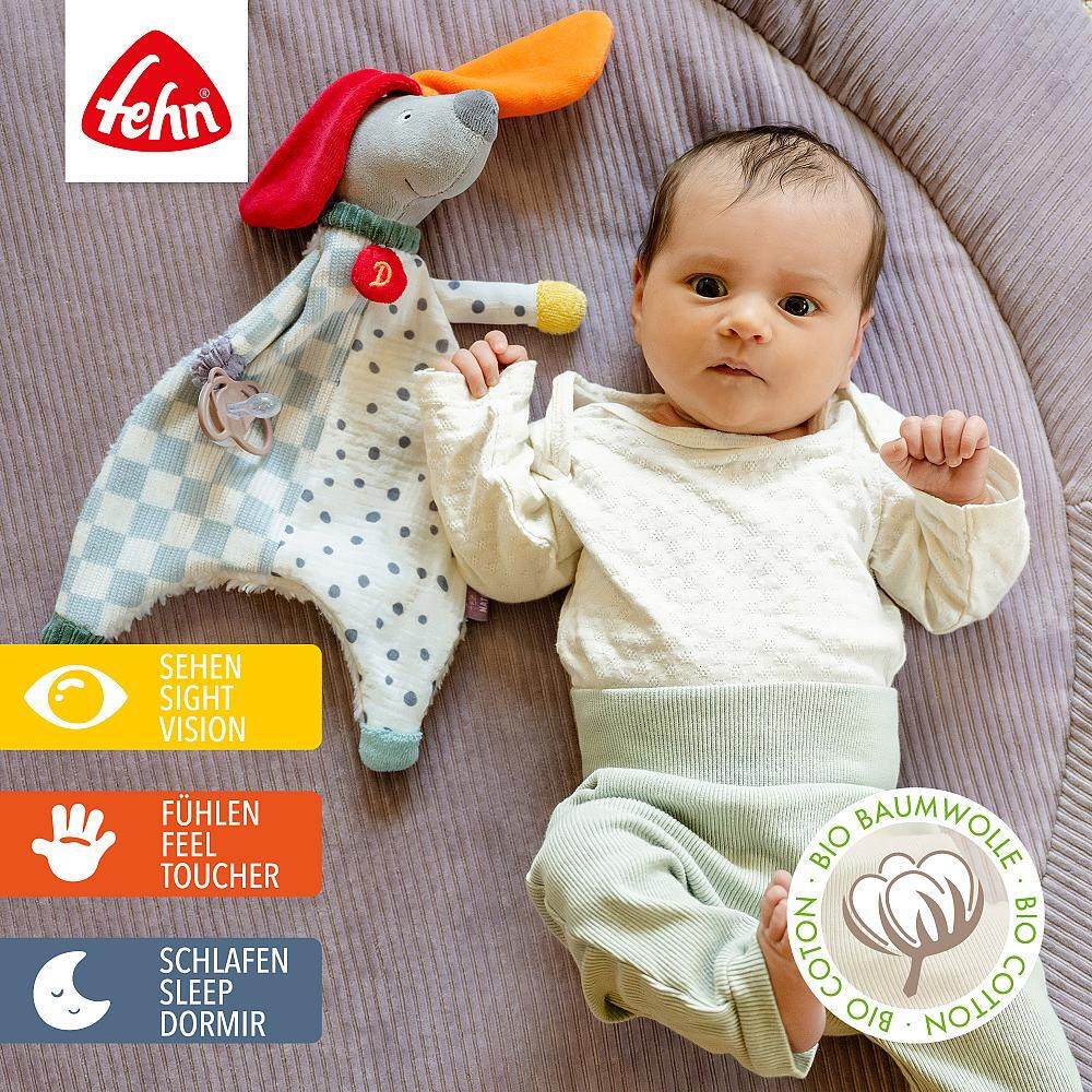 Doudou bebelusi cu suzeta din colecția FehnNATUR® Dog Dotty Collection este companionul ideal pentru joacă, somn și plimbări. Realizat din bumbac organic moale și texturi variate, acest cățeluș oferă protecție emoțională și liniște bebelușului, ajutându-l să se simtă în siguranță în orice moment.