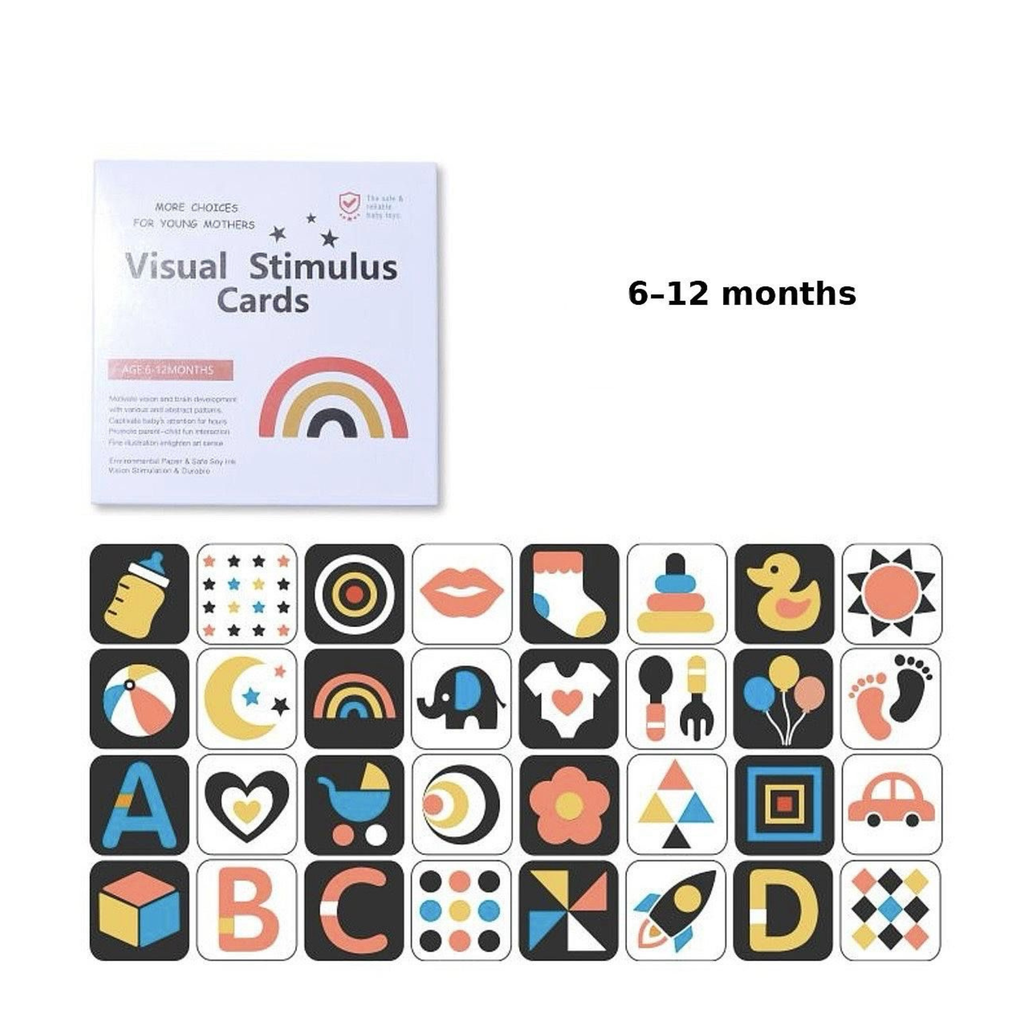 Cardurile pentru stimulare vizuală Visual Stimulus Cards, 6-12 luni, sunt concepute pentru etapa în care bebelușul începe să perceapă mai clar culorile și să recunoască forme, obiecte și simboluri familiare. Acest set utilizează combinații de culori contrastante și imagini variate pentru a susține dezvoltarea vizuală și cognitivă. Spre deosebire de etapele anterioare, cardurile includ elemente mai complexe precum litere (A, B, C, D), obiecte uzuale, animale, forme geometrice și simboluri, ajutând copilul să facă primele conexiuni vizuale și să își dezvolte capacitatea de recunoaștere.