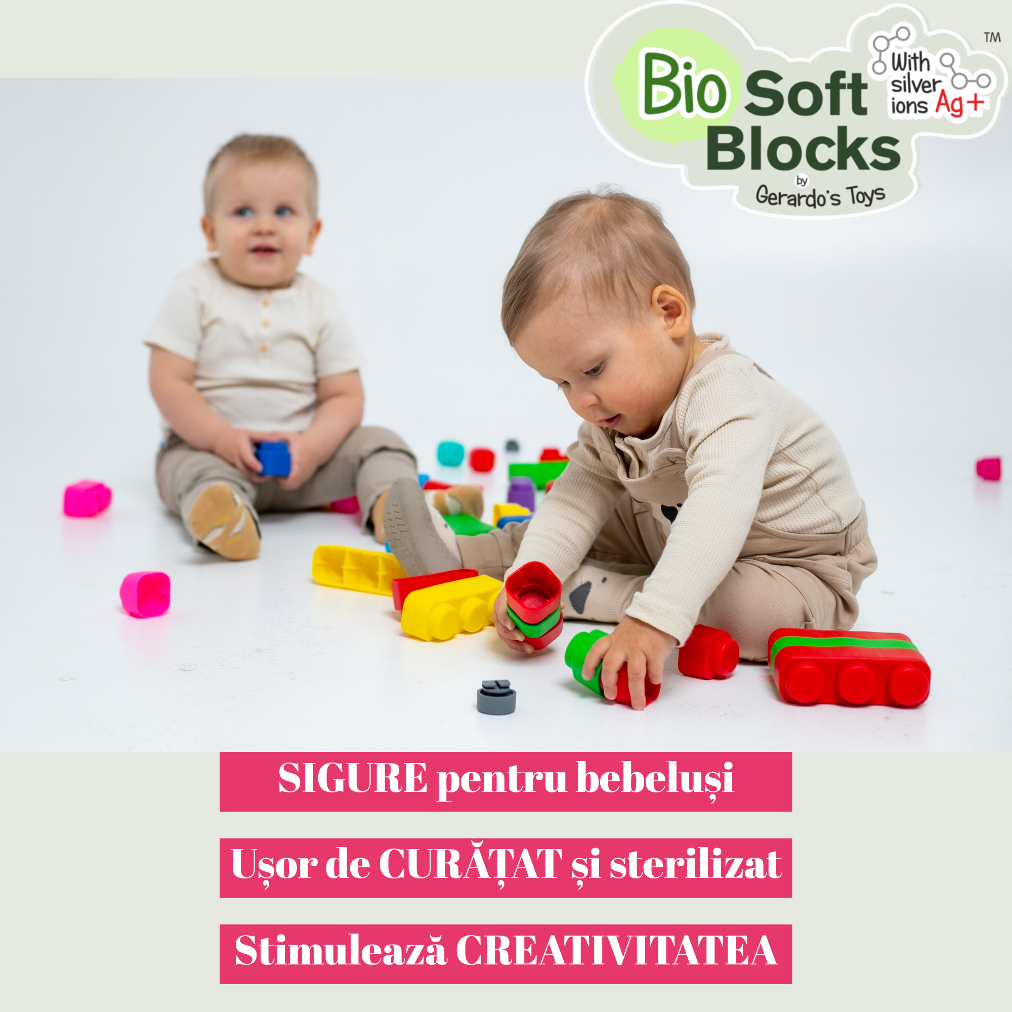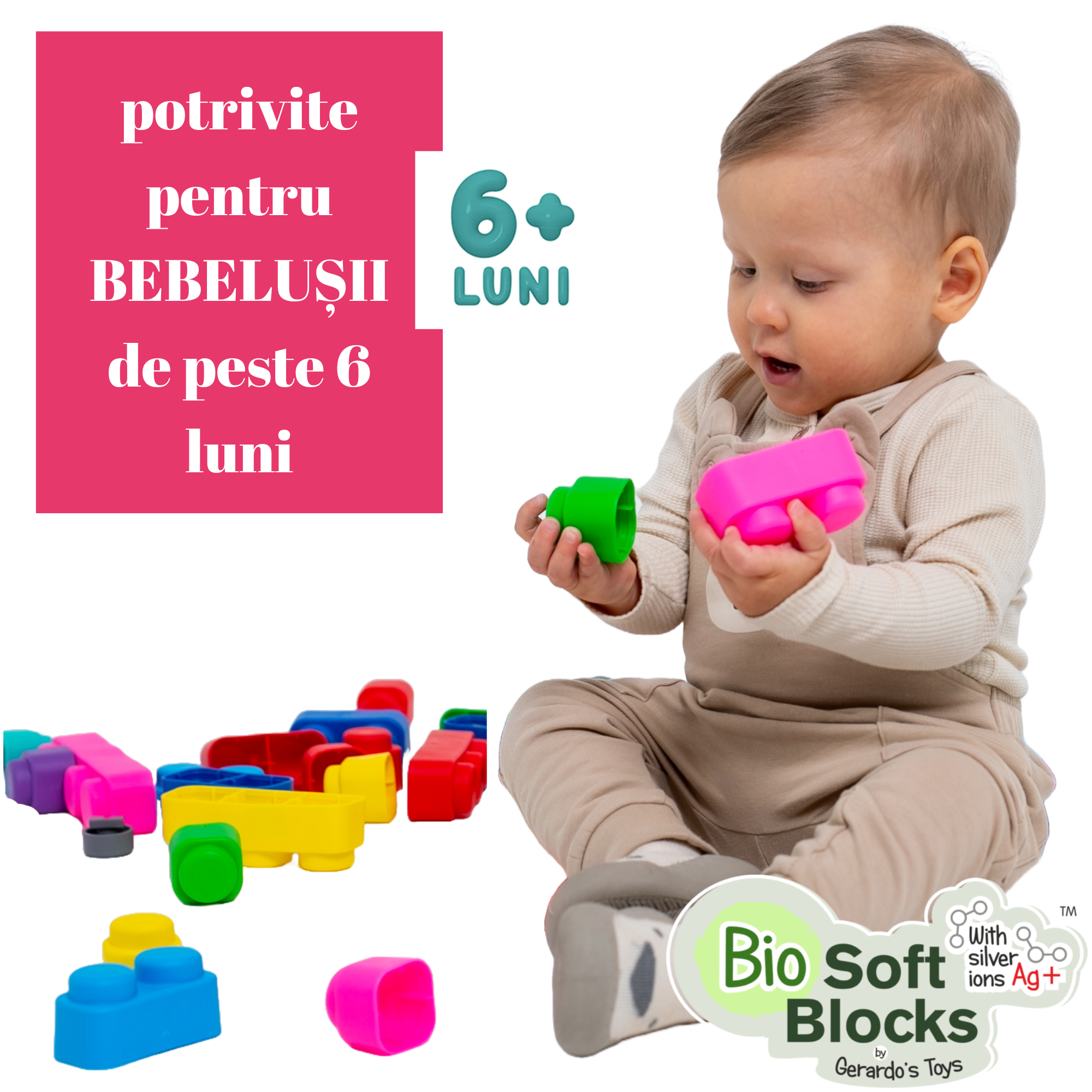 Fabricate din material moale, flexibil, non-toxic și antibacterian, blocurile sunt sigure pentru mânuțele mici, pentru gingii sensibile și pot fi utilizate inclusiv în perioada de dentiție.